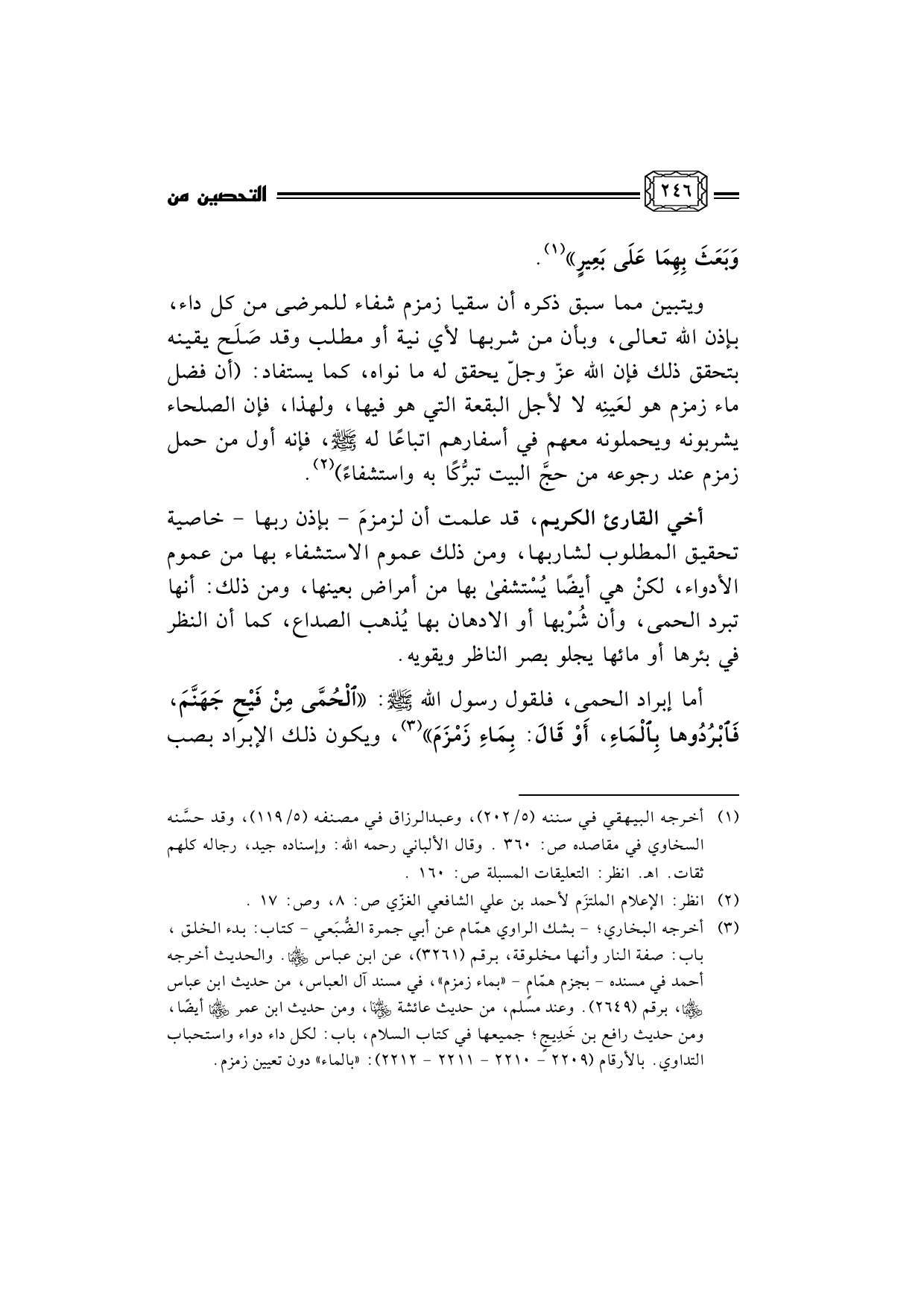 (¬3) أخرجه البخاري؛ - بشك الراوي همّام عن أبي جمرة الضُّبَعي - كتاب: بدء الخلق، باب: صفة النار وأنها مخلوقة، برقم (3261) ، عن ابن عباس رضي الله عنهما. والحديث أخرجه أحمد في مسنده - بجزم همّامٍ - «بماء زمزم» ، في مسند آل العباس، من حديث ابن عباس رضي الله عنهما، برقم (2649) . وعند مسلم، من حديث عائشة رضي الله عنها، ومن حديث ابن عمر رضي الله عنهما أيضًا، ومن حديث رافع بن خَدِيجٍ؛ جميعها في كتاب السلام، باب: لكل داء دواء واستحباب التداوي. بالأرقام (2209 - 2210 - 2211 - 2212) : «بالماء» دون تعيين زمزم.