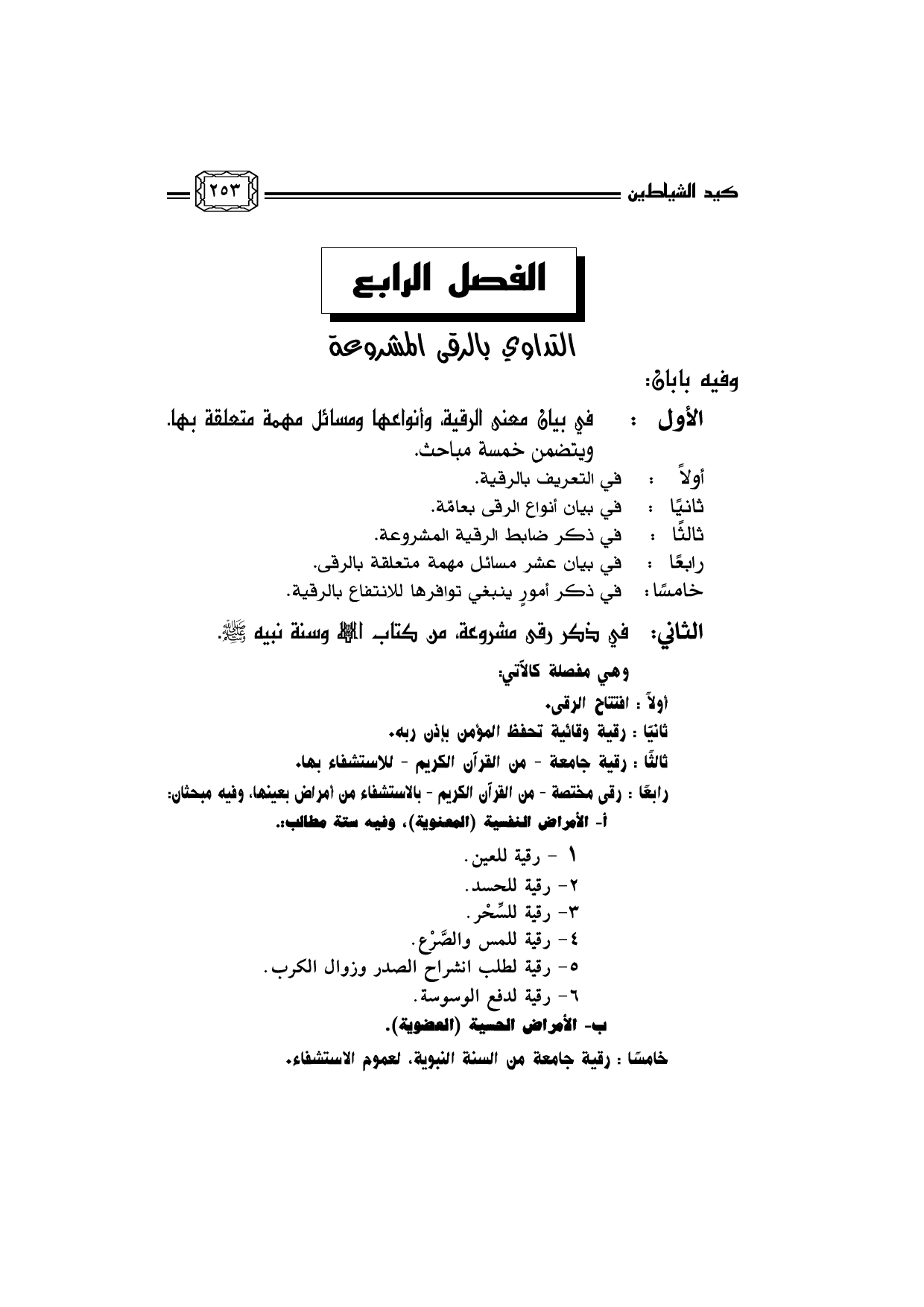 الثاني: في ذكر رقى مشروعة، من كتاب الله وسنة نبيه صلى الله عليه وسلم.