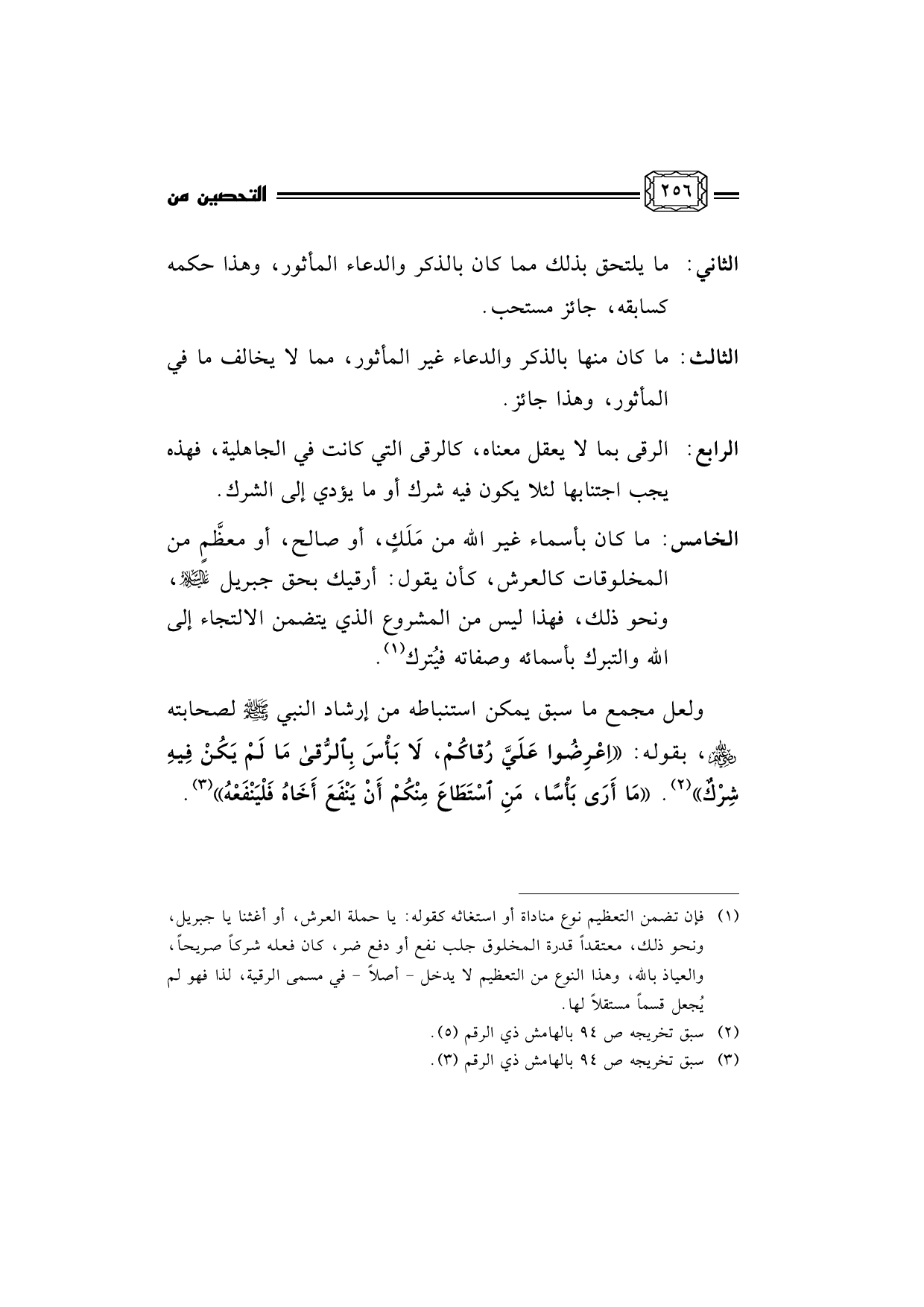 الخامس: ما كان بأسماء غير الله من مَلَكٍ، أو صالح، أو معظَّمٍ من المخلوقات كالعرش، كأن يقول: أرقيك بحق جبريل عليه السلام، ونحو ذلك، فهذا ليس من المشروع الذي يتضمن الالتجاء إلى الله والتبرك بأسمائه وصفاته فيُترك (¬1) .