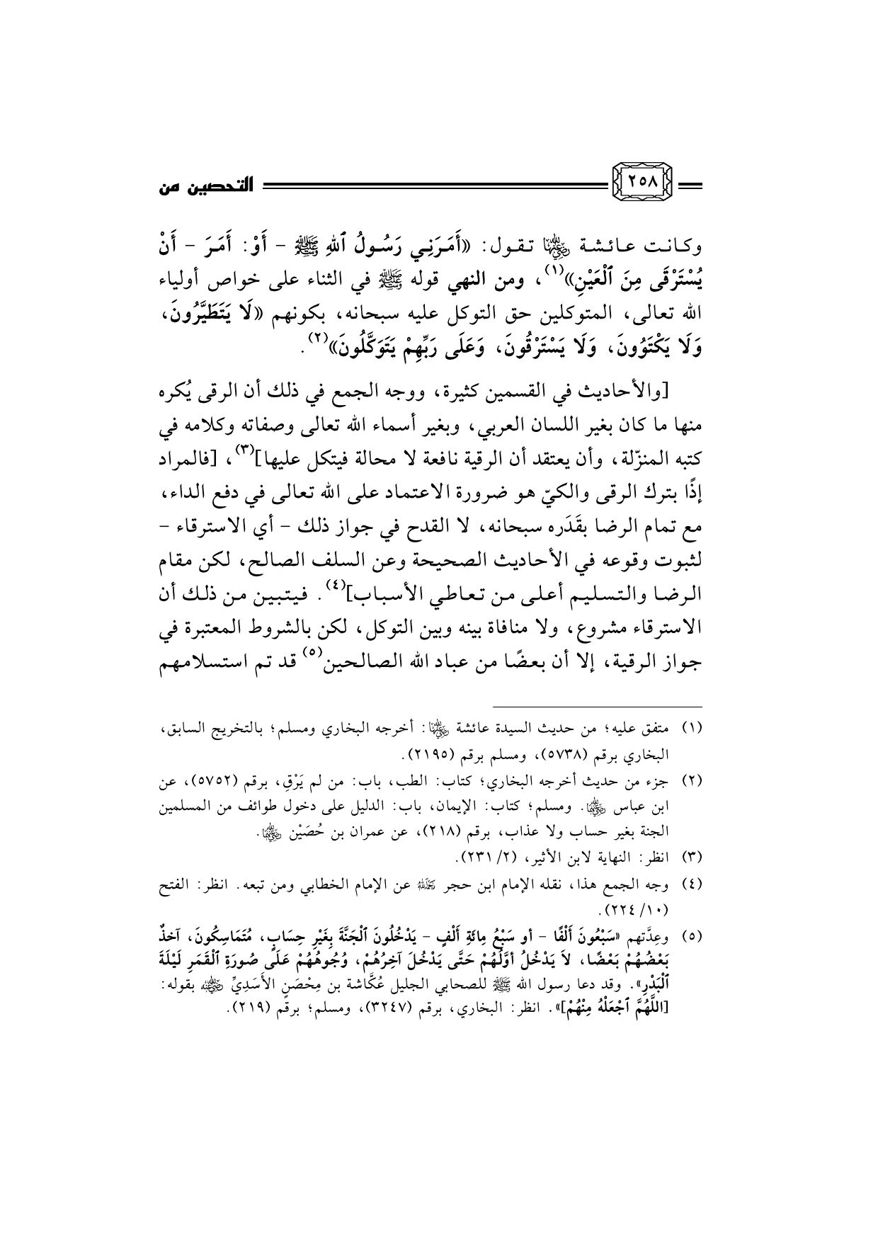 [والأحاديث في القسمين كثيرة، ووجه الجمع في ذلك أن الرقى يُكره منها ما كان بغير اللسان العربي، وبغير أسماء الله تعالى وصفاته وكلامه في كتبه المنزّلة، وأن يعتقد أن الرقية نافعة لا محالة فيتكل عليها] (¬3) ، [فالمراد إذًا بترك الرقى والكيّ هو ضرورة الاعتماد على الله تعالى في دفع الداء، مع تمام الرضا بقَدَره سبحانه، لا القدح في جواز ذلك - أي الاسترقاء - لثبوت وقوعه في الأحاديث الصحيحة وعن السلف الصالح، لكن مقام الرضا والتسليم أعلى من تعاطي الأسباب] (¬4) . فيتبين من ذلك أن الاسترقاء مشروع، ولا منافاة بينه وبين التوكل، لكن بالشروط المعتبرة في جواز الرقية، إلا أن بعضًا من عباد الله الصالحين (¬5) قد تم استسلامهم