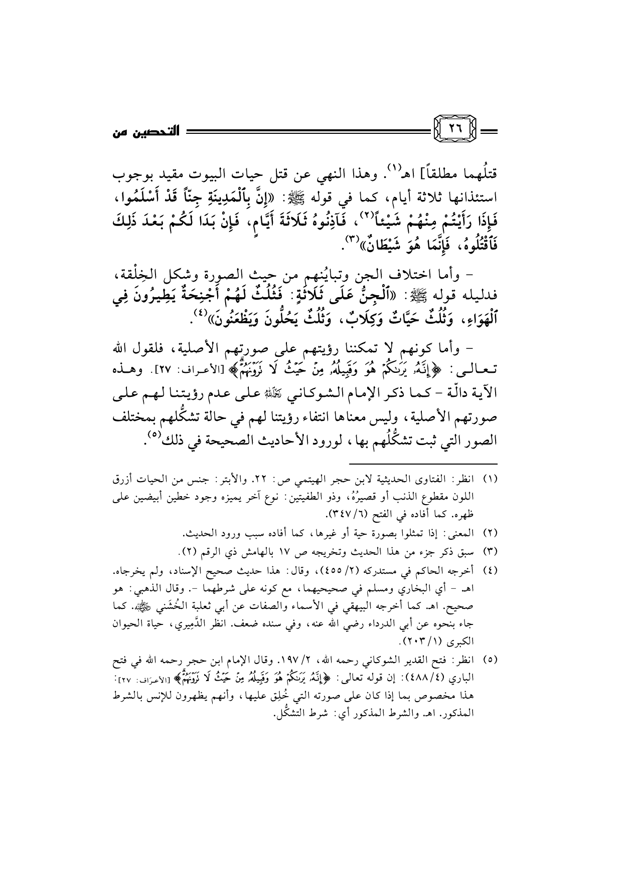 (¬5) انظر: فتح القدير الشوكاني رحمه الله، 2/197. وقال الإمام ابن حجر رحمه الله في فتح الباري (4/488) : إن قوله تعالى: ُ ق ف چ؛: 9 ژ؟ ِ [الأعرَاف: 27] {إِنَّهُ يَرَاكُمْ هُوَ وَقَبِيلُهُ مِنْ حَيْثُ لاَ تَرَوْنَهُمْ} : هذا مخصوص بما إذا كان على صورته التي خُلِق عليها، وأنهم يظهرون للإنس بالشرط المذكور. اهـ. والشرط المذكور أي: شرط التشكُّل.