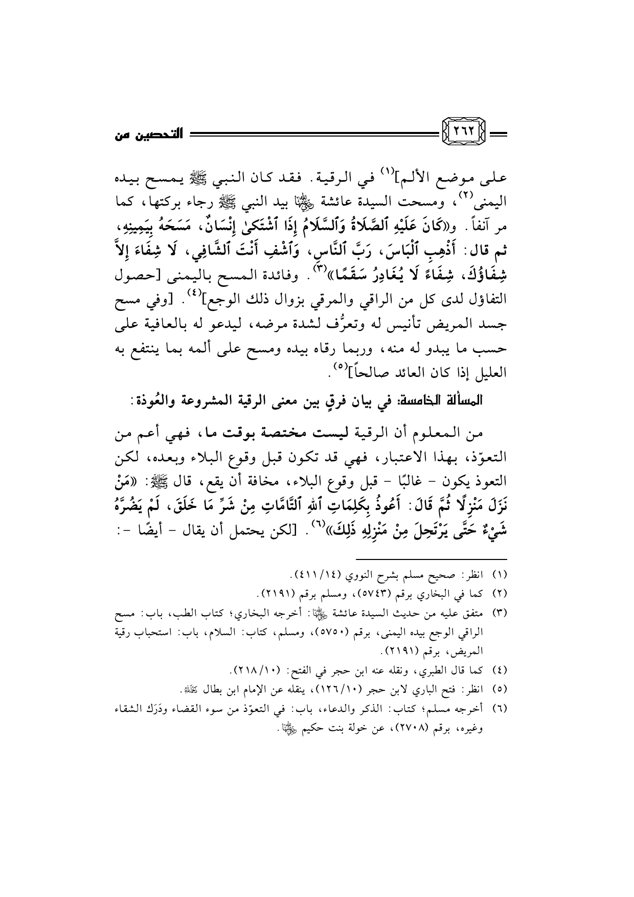 على موضع الألم] (¬1) في الرقية. فقد كان النبي صلى الله عليه وسلم يمسح بيده اليمنى (¬2) ، ومسحت السيدة عائشة رضي الله عنها بيد النبي صلى الله عليه وسلم رجاء بركتها، كما مر آنفاً. وكَانَ عَلَيْهِ الصَّلاَةُ وَالسَّلاَمُ إِذَا اشْتَكى إِنْسَانٌ، مَسَحَهُ بِيَمِينِهِ، ثم قال: أَذْهِبِ الْبَاسَ، رَبَّ النَّاسِ، وَاشْفِ أَنْتَ الشَّافِي، لاَ شِفَاءَ إِلاَّ شِفَاؤُكَ، شِفَاءً لاَ يُغَادِرُ سَقَمًا (¬3) . وفائدة المسح باليمنى [حصول التفاؤل لدى كل من الراقي والمرقي بزوال ذلك الوجع] (¬4) . [وفي مسح جسد المريض تأنيس له وتعرُّف لشدة مرضه، ليدعو له بالعافية على حسب ما يبدو له منه، وربما رقاه بيده ومسح على ألمه بما ينتفع به العليل إذا كان العائد صالحاً] (¬5) .