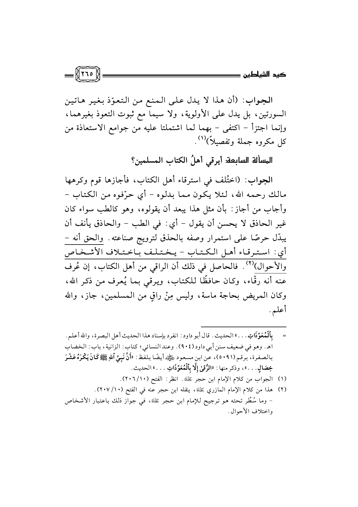 الجواب: (اختُلف في استرقاء أهل الكتاب، فأجازها قوم وكرهها مالك رحمه الله، لئلا يكون مما بدلوه - أي حرّفوه من الكتاب - وأجاب من أجاز: بأن مثل هذا يبعد أن يقولوه، وهو كالطب سواء كان غير الحاذق لا يحسن أن يقول - أي: في الطب - والحاذق يأنف أن يبدّل حرصًا على استمرار وصفه بالحذق لترويج صناعته. والحق أنه - أي: استرقاء أهل الكتاب - يختلف باختلاف الأشخاص والأحوال) (¬2) . فالحاصل في ذلك أن الراقي من أهل الكتاب، إن عُرف عنه أنه رقّاء، وكان حافظًا للكتاب، ويرقي بما يُعرف من ذكر الله، وكان المريض بحاجة ماسة، وليس مِنْ راقٍ من المسلمين، جاز، والله أعلم.