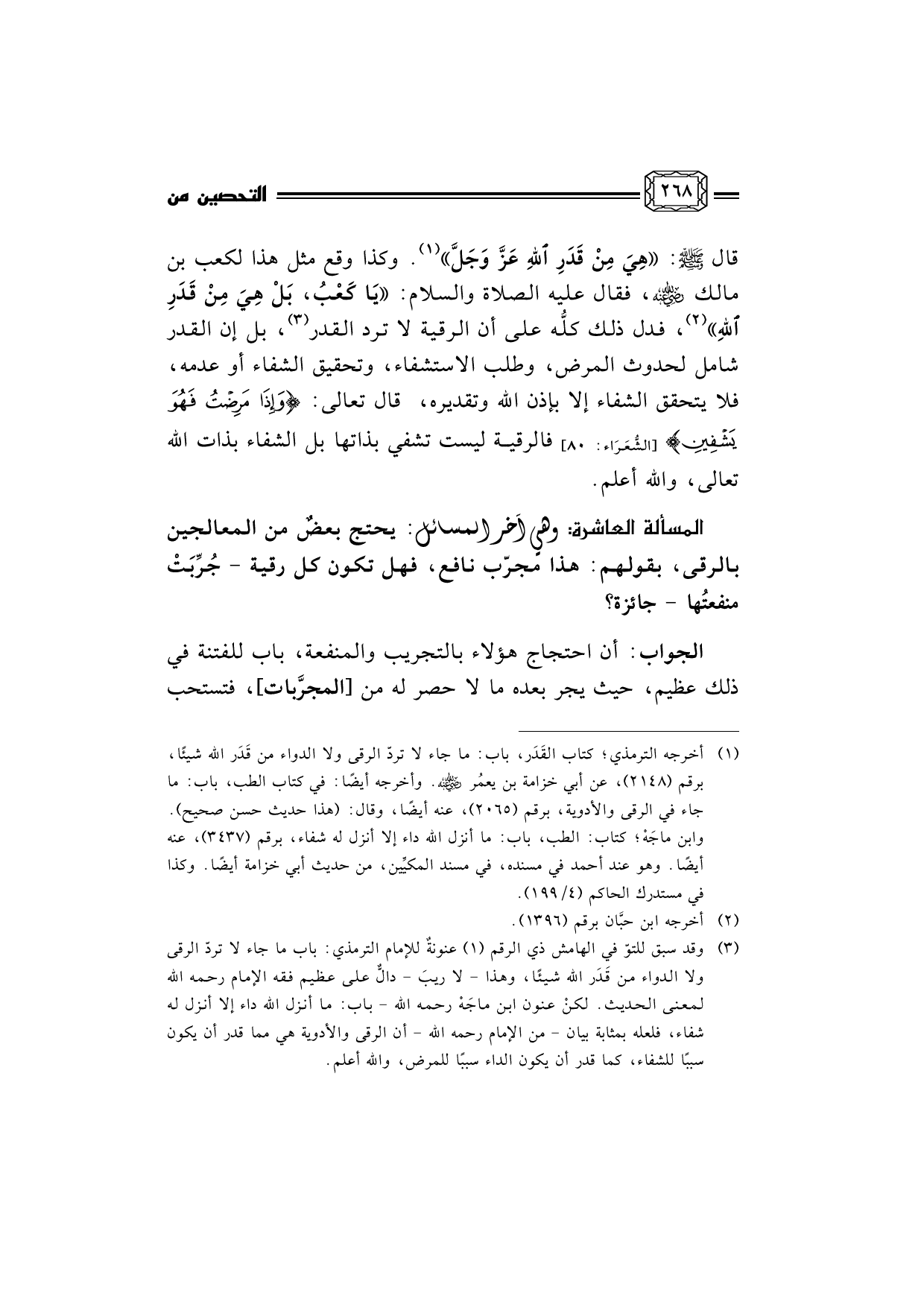 قال صلى الله عليه وسلم: هِيَ مِنْ قَدَرِ اللهِ عَزَّ وَجَلَّ (¬1) . وكذا وقع مثل هذا لكعب بن مالك رضي الله عنه، فقال عليه الصلاة والسلام: يَا كَعْبُ، بَلْ هِيَ مِنْ قَدَرِ اللهِ (¬2) ، فدل ذلك كلُّه على أن الرقية لا ترد القدر (¬3) ، بل إن القدر شامل لحدوث المرض، وطلب الاستشفاء، وتحقيق الشفاء أو عدمه، فلا يتحقق الشفاء إلا بإذن الله وتقديره، قال تعالى: [الشُّعَرَاء: 80] {وَإِذَا مَرِضْتُ فَهُوَ يَشْفِينِ *} فالرقية ليست تشفي بذاتها بل الشفاء بذات الله تعالى، والله أعلم.