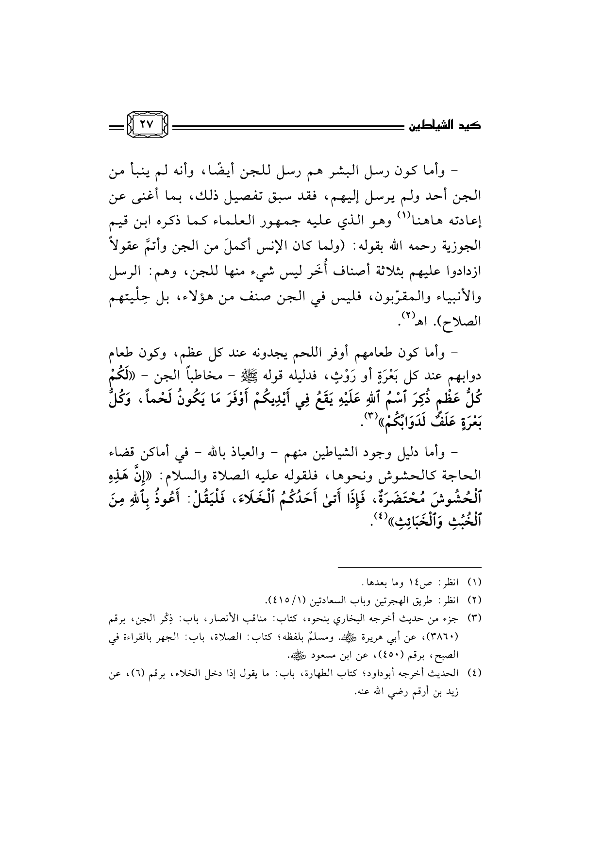 - وأما دليل وجود الشياطين منهم - والعياذ بالله - في أماكن قضاء الحاجة كالحشوش ونحوها، فلقوله عليه الصلاة والسلام: إِنَّ هَذِهِ الْحُشُوشَ مُحْتَضَرَةٌ، فَإِذَا أَتى أَحَدُكُمُ الْخَلاَءَ، فَلْيَقُلْ: أَعُوذُ بِاللهِ مِنَ الْخُبُثِ وَالْخَبَائِثِ (¬4) .