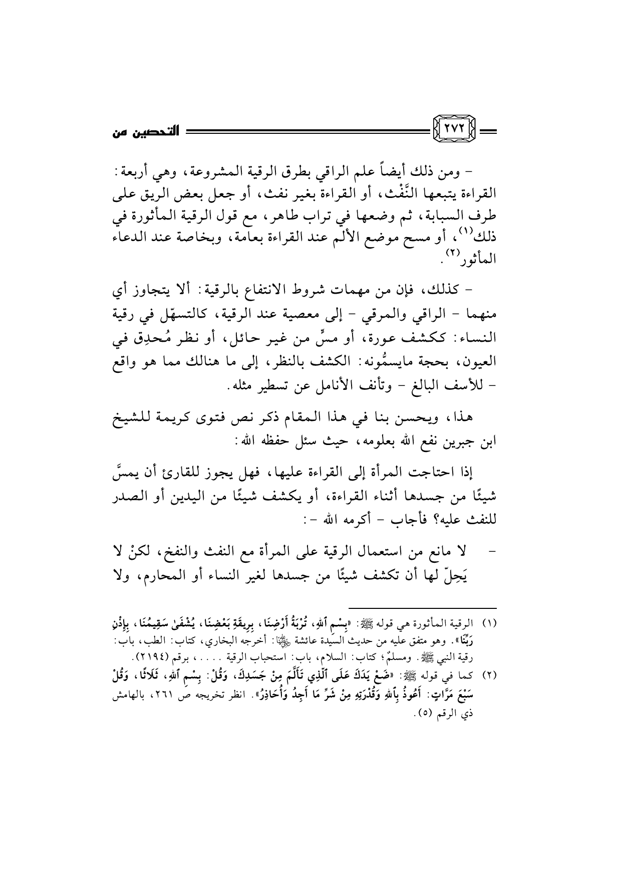 - ... لا مانع من استعمال الرقية على المرأة مع النفث والنفخ، لكنْ لا يَحِلّ لها أن تكشف شيئًا من جسدها لغير النساء أو المحارم، ولا