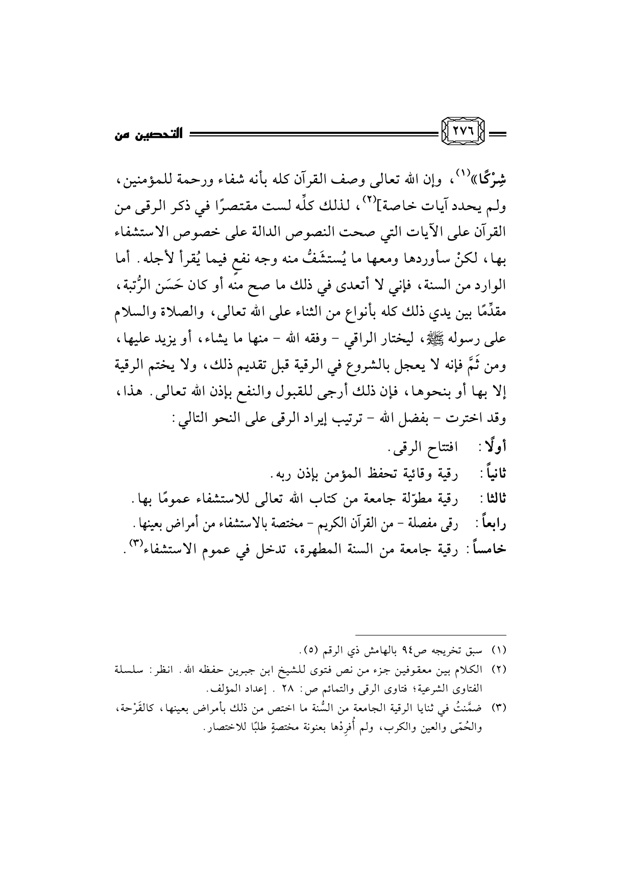 شِرْكًا (¬1) ، وإن الله تعالى وصف القرآن كله بأنه شفاء ورحمة للمؤمنين، ولم يحدد آيات خاصة] (¬2) ، لذلك كلِّه لست مقتصرًا في ذكر الرقى من القرآن على الآيات التي صحت النصوص الدالة على خصوص الاستشفاء بها، لكنْ سأوردها ومعها ما يُستشَفُّ منه وجه نفعٍ فيما يُقرأ لأجله. أما الوارد من السنة، فإني لا أتعدى في ذلك ما صح منه أو كان حَسَن الرُّتبة، مقدِّمًا بين يدي ذلك كله بأنواع من الثناء على الله تعالى، والصلاة والسلام على رسوله صلى الله عليه وسلم، ليختار الراقي - وفقه الله - منها ما يشاء، أو يزيد عليها، ومن ثَمَّ فإنه لا يعجل بالشروع في الرقية قبل تقديم ذلك، ولا يختم الرقية إلا بها أو بنحوها، فإن ذلك أرجى للقبول والنفع بإذن الله تعالى. هذا، وقد اخترت - بفضل الله - ترتيب إيراد الرقى على النحو التالي: