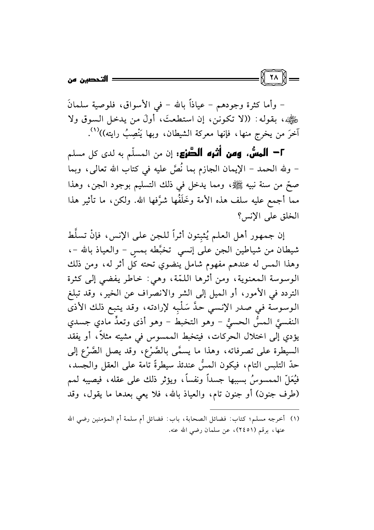 2- المسُّ، ومن أثره الصَّرْع: إن من المسلّم به لدى كل مسلم - ولله الحمد - الإيمان الجازم بما نُصَّ عليه في كتاب الله تعالى، وبما صحّ من سنة نبيه صلى الله عليه وسلم، ومما يدخل في ذلك التسليم بوجود الجن، وهذا مما أجمع عليه سلف هذه الأمة وخَلَفُها شرَّفها الله. ولكن، ما تأثير هذا الخلق على الإنس؟