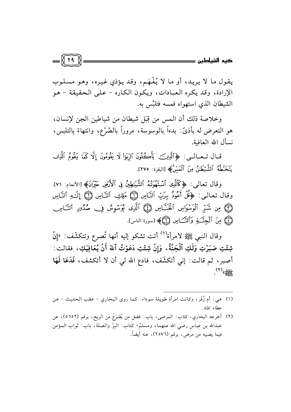 (¬2) أخرجه البخاري، كتاب: المرضى، باب: فضل من يُصْرَعُ من الريح، برقم (5652) ، عن عبد الله بن عباس رضي الله عنهما، ومسلمٌ؛ كتاب: البِرّ والصلة، باب: ثواب المؤمن فيما يصيبه من مرض، برقم (2576) ، عنه أيضاً.