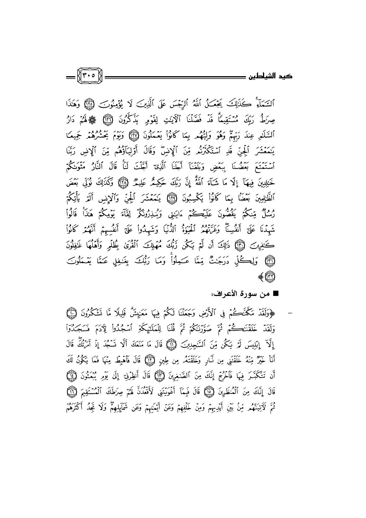 السَّمَاءِ كَذَلِكَ يَجْعَلُ اللَّهُ الرِّجْسَ عَلَى الَّذِينَ لاَ يُؤْمِنُونَ *وَهَذَا صِرَاطُ رَبِّكَ مُسْتَقِيمًا قَدْ فَصَّلْنَا الآْيَاتِ لِقَوْمٍ يَذَّكَّرُونَ *لَهُمْ دَارُ السَّلاَمِ عِنْدَ رَبِّهِمْ وَهُوَ وَلِيُّهُمْ بِمَا كَانُوا يَعْمَلُونَ *وَيَوْمَ يَحْشُرُهُمْ جَمِيعًا يَامَعْشَرَ الْجِنِّ قَدِ اسْتَكْثَرْتُمْ مِنَ الإِْنْسِ وَقَالَ أَوْلِيَاؤُهُمْ مِنَ الإِْنْسِ رَبَّنَا اسْتَمْتَعَ بَعْضُنَا بِبَعْضٍ وَبَلَغْنَا أَجَلَنَا الَّذِي أَجَّلْتَ لَنَا قَالَ النَّارُ مَثْوَاكُمْ خَالِدِينَ فِيهَا إِلاَّ مَا شَاءَ اللَّهُ إِنَّ رَبَّكَ حَكِيمٌ عَلِيمٌ *وَكَذَلِكَ نُوَلِّي بَعْضَ الظَّالِمِينَ بَعْضًا بِمَا كَانُوا يَكْسِبُونَ *يَامَعْشَرَ الْجِنِّ وَالإِْنْسِ أَلَمْ يَأْتِكُمْ رُسُلٌ مِنْكُمْ يَقُصُّونَ عَلَيْكُمْ آيَاتِي وَيُنْذِرُونَكُمْ لِقَاءَ يَوْمِكُمْ هَذَا قَالُوا شَهِدْنَا عَلَى أَنْفُسِنَا وَغَرَّتْهُمُ الْحَيَاةُ الدُّنيَا وَشَهِدُوا عَلَى أَنْفُسِهِمْ أَنَّهُمْ كَانُوا