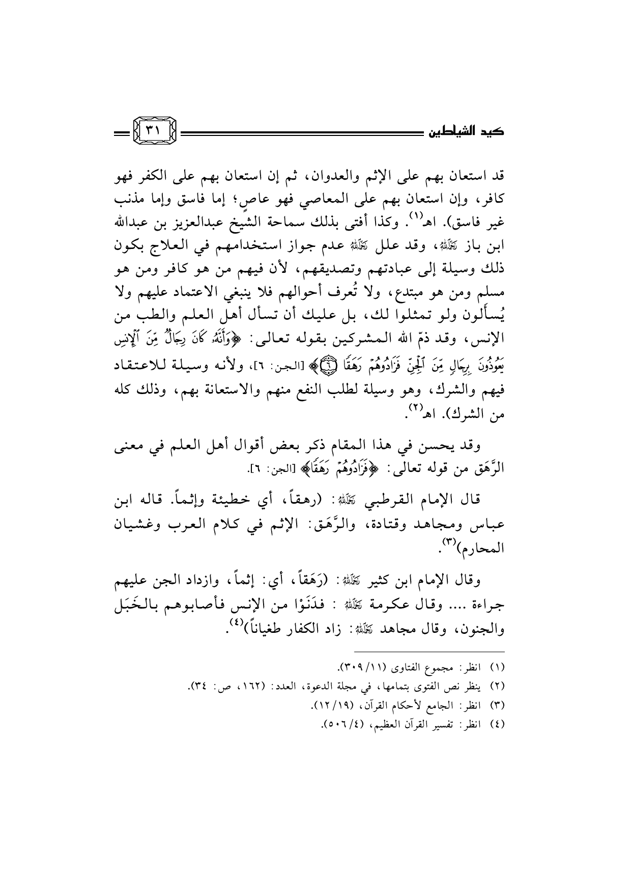 قد استعان بهم على الإثم والعدوان، ثم إن استعان بهم على الكفر فهو كافر، وإن استعان بهم على المعاصي فهو عاصٍ؛ إما فاسق وإما مذنب غير فاسق) . اهـ (¬1) . وكذا أفتى بذلك سماحة الشيخ عبد العزيز بن عبد الله ابن باز رحمه الله، وقد علل رحمه الله عدم جواز استخدامهم في العلاج بكون ذلك وسيلة إلى عبادتهم وتصديقهم، لأن فيهم من هو كافر ومن هو مسلم ومن هو مبتدع، ولا تُعرف أحوالهم فلا ينبغي الاعتماد عليهم ولا يُسأَلون ولو تمثلوا لك، بل عليك أن تسأل أهل العلم والطب من الإنس، وقد ذمّ الله المشركين بقوله تعالى: {وَأَنَّهُ كَانَ رِجَالٌ مِنَ الإِنْسِ يَعُوذُونَ بِرِجَالٍ مِنَ الْجِنِّ فَزَادُوهُمْ رَهَقًا *} [الجن: 6] ، ولأنه وسيلة للاعتقاد فيهم والشرك، وهو وسيلة لطلب النفع منهم والاستعانة بهم، وذلك كله من الشرك) . اهـ (¬2) .