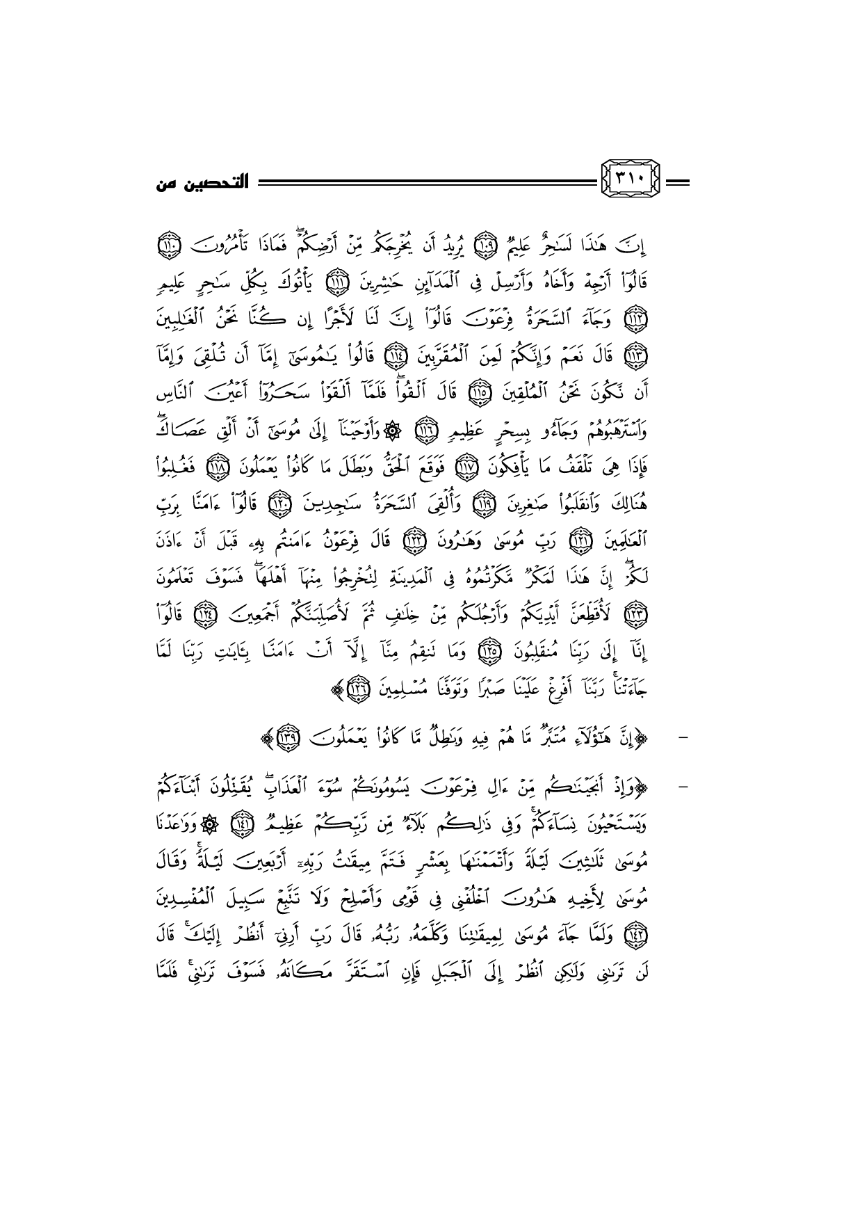 إِنَّ هَذَا لَسَاحِرٌ عَلِيمٌ *يُرِيدُ أَنْ يُخْرِجَكُمْ مِنْ أَرْضِكُمْ فَمَاذَا تَأْمُرُونَ *قَالُوا أَرْجِهْ وَأَخَاهُ وَأَرْسِلْ فِي الْمَدَائِنِ حَاشِرِينَ *يَأْتُوكَ بِكُلِّ سَاحِرٍ عَلِيمٍ *وَجَاءَ السَّحَرَةُ فِرْعَوْنَ قَالُوا إِنَّ لَنَا لأَجْرًا إِنْ كُنَّا نَحْنُ الْغَالِبِينَ *قَالَ نَعَمْ وَإِنَّكُمْ لَمِنَ الْمُقَرَّبِينَ *قَالُوا يَامُوسَى إِمَّا أَنْ تُلْقِيَ وَإِمَّا أَنْ نَكُونَ نَحْنُ الْمُلْقِينَ *قَالَ أَلْقُوا فَلَمَّا أَلْقَوْا سَحَرُوا أَعْيُنَ النَّاسِ وَاسْتَرْهَبُوهُمْ وَجَاءُوا بِسِحْرٍ عَظِيمٍ *وَأَوْحَيْنَا إِلَى مُوسَى أَنْ أَلْقِ عَصَاكَ فَإِذَا هِيَ تَلْقَفُ مَا يَأْفِكُونَ *فَوَقَعَ الْحَقُّ وَبَطَلَ مَا كَانُوا يَعْمَلُونَ *فَغُلِبُوا هُنَالِكَ وَانْقَلَبُوا صَاغِرِينَ *وَأُلْقِيَ السَّحَرَةُ سَاجِدِينَ *قَالُوا آمَنَّا بِرَبِّ الْعَالَمِينَ *رَبِّ مُوسَى وَهَارُونَ *قَالَ فِرْعَوْنُ آمَنْتُمْ بِهِ قَبْلَ أَنْ آذَنَ لَكُمْ إِنَّ هَذَا لَمَكْرٌ مَكَرْتُمُوهُ فِي الْمَدِينَةِ لِتُخْرِجُوا مِنْهَا أَهْلَهَا فَسَوْفَ تَعْلَمُونَ *لأَُقَطِّعَنَّ أَيْدِيَكُمْ وَأَرْجُلَكُمْ