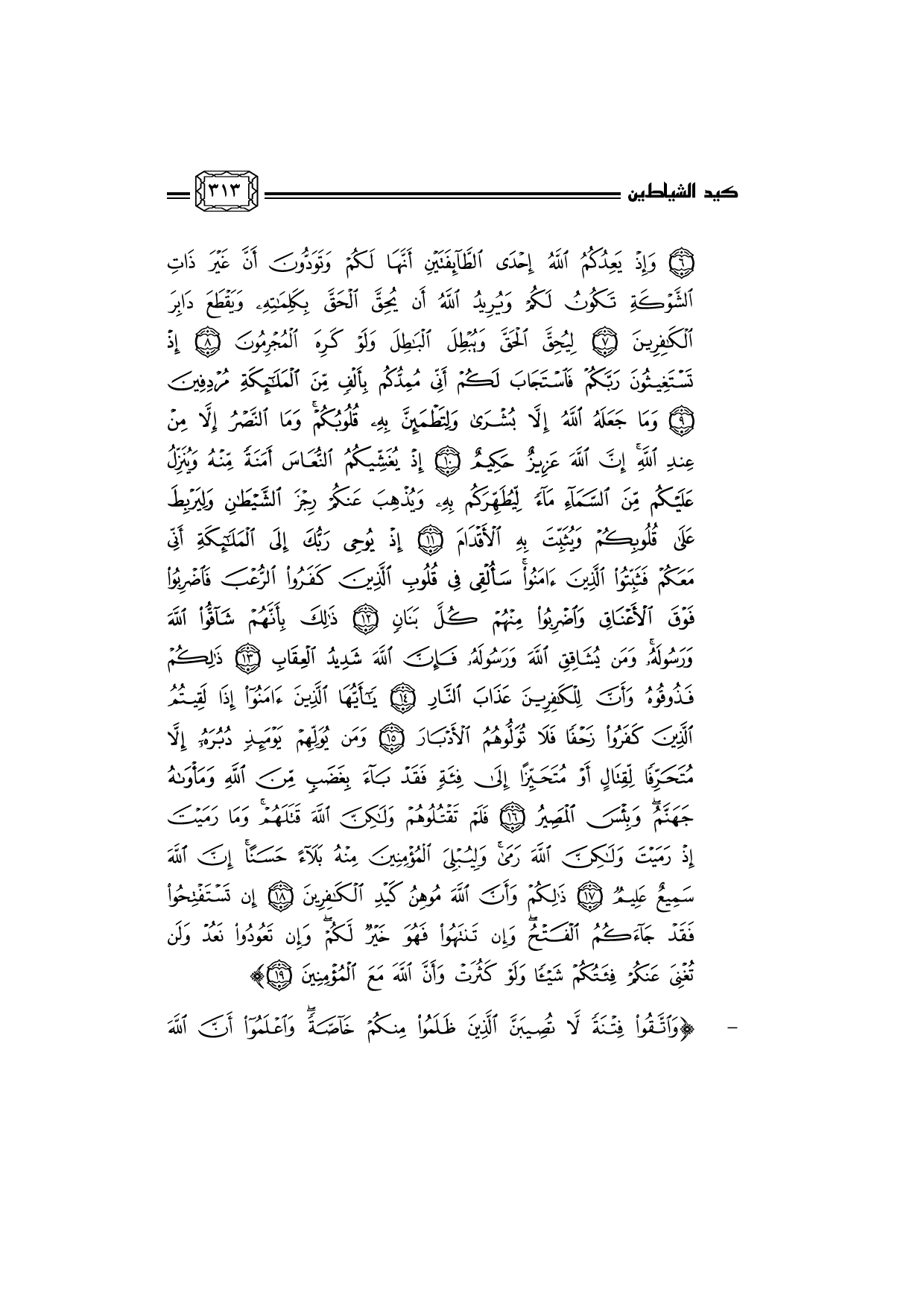 وَإِذْ يَعِدُكُمُ اللَّهُ إِحْدَى الطَّائِفَتَيْنِ أَنَّهَا لَكُمْ وَتَوَدُّونَ أَنَّ غَيْرَ ذَاتِ الشَّوْكَةِ تَكُونُ لَكُمْ وَيُرِيدُ اللَّهُ أَنْ يُحِقَّ الْحَقَّ بِكَلِمَاتِهِ وَيَقْطَعَ دَابِرَ الْكَافِرِينَ *لِيُحِقَّ الْحَقَّ وَيُبْطِلَ الْبَاطِلَ وَلَوْ كَرِهَ الْمُجْرِمُونَ *إِذْ تَسْتَغِيثُونَ رَبَّكُمْ فَاسْتَجَابَ لَكُمْ أَنِّي مُمِدُّكُمْ بِأَلْفٍ مِنَ الْمَلاَئِكَةِ مُرْدِفِينَ *وَمَا جَعَلَهُ اللَّهُ إِلاَّ بُشْرَى وَلِتَطْمَئِنَّ بِهِ قُلُوبُكُمْ وَمَا النَّصْرُ إِلاَّ مِنْ عِنْدِ اللَّهِ إِنَّ اللَّهَ عَزِيزٌ حَكِيمٌ *إِذْ يُغَشِّيكُمُ النُّعَاسَ أَمَنَةً مِنْهُ وَيُنَزِّلُ عَلَيْكُمْ مِنَ السَّمَاءِ مَاءً لِيُطَهِّرَكُمْ بِهِ وَيُذْهِبَ عَنْكُمْ رِجْزَ الشَّيْطَانِ وَلِيَرْبِطَ عَلَى قُلُوبِكُمْ وَيُثَبِّتَ بِهِ الأَقْدَامَ *إِذْ يُوحِي رَبُّكَ إِلَى الْمَلاَئِكَةِ أَنِّي مَعَكُمْ فَثَبِّتُوا الَّذِينَ آمَنُوا سَأُلْقِي فِي قُلُوبِ الَّذِينَ