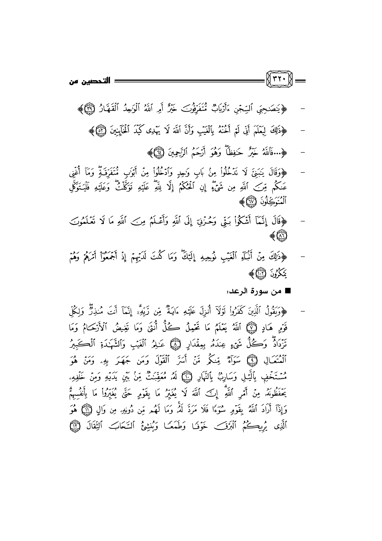 - ... {وَيَقُولُ الَّذِينَ كَفَرُوا لَوْلاَ أُنْزِلَ عَلَيْهِ آيَةٌ مِنْ رَبِّهِ إِنَّمَا أَنْتَ مُنْذِرٌ وَلِكُلِّ قَوْمٍ هَادٍ *اللَّهُ يَعْلَمُ مَا تَحْمِلُ كُلُّ أُنْثَى وَمَا تَغِيضُ الأَرْحَامُ وَمَا تَزْدَادُ وَكُلُّ شَيْءٍ عِنْدَهُ بِمِقْدَارٍ *عَالِمُ الْغَيْبِ وَالشَّهَادَةِ الْكَبِيرُ الْمُتَعَالِ *سَوَاءٌ مِنْكُمْ مَنْ أَسَرَّ الْقَوْلَ وَمَنْ جَهَرَ بِهِ وَمَنْ هُوَ مُسْتَخْفٍ بِاللَّيْلِ وَسَارِبٌ بِالنَّهَارِ *لَهُ مُعَقِّبَاتٌ مِنْ بَيْنِ يَدَيْهِ وَمِنْ خَلْفِهِ يَحْفَظُونَهُ مِنْ أَمْرِ اللَّهِ إِنَّ اللَّهَ لاَ يُغَيِّرُ مَا بِقَوْمٍ حَتَّى يُغَيِّرُوا مَا بِأَنْفُسِهِمْ وَإِذَا أَرَادَ اللَّهُ بِقَوْمٍ سُوءًا فَلاَ مَرَدَّ لَهُ وَمَا لَهُمْ مِنْ دُونِهِ مِنْ وَالٍ *هُوَ الَّذِي يُرِيكُمُ الْبَرْقَ خَوْفًا وَطَمَعًا وَيُنْشِىءُ السَّحَابَ الثِّقَالَ