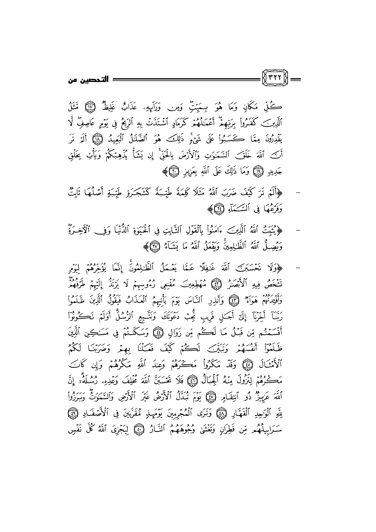 - ... {وَلاَ تَحْسَبَنَّ اللَّهَ غَافِلاً عَمَّا يَعْمَلُ الظَّالِمُونَ إِنَّمَا يُؤَخِّرُهُمْ لِيَوْمٍ تَشْخَصُ فِيهِ الأَبْصَارُ *مُهْطِعِينَ مُقْنِعِي رُؤُوسِهِمْ لاَ يَرْتَدُّ إِلَيْهِمْ طَرْفُهُمْ وَأَفْئِدَتُهُمْ هَوَاءٌ *وَأَنْذِرِ النَّاسَ يَوْمَ يَأْتِيهِمُ الْعَذَابُ فَيَقُولُ الَّذِينَ ظَلَمُوا رَبَّنَا أَخِّرْنَا إِلَى أَجَلٍ قَرِيبٍ نُجِبْ دَعْوَتَكَ وَنَتَّبِعِ الرُّسُلَ أَوَلَمْ تَكُونُوا أَقْسَمْتُمْ مِنْ قَبْلُ مَا لَكُمْ مِنْ زَوَالٍ *وَسَكَنْتُمْ فِي مَسَاكِنِ الَّذِينَ ظَلَمُوا أَنْفُسَهُمْ وَتَبَيَّنَ لَكُمْ كَيْفَ فَعَلْنَا بِهِمْ وَضَرَبْنَا لَكُمُ الأَمْثَالَ *وَقَدْ مَكَرُوا مَكْرَهُمْ وَعِنْدَ اللَّهِ مَكْرُهُمْ وَإِنْ كَانَ مَكْرُهُمْ لِتَزُولَ مِنْهُ الْجِبَالُ *فَلاَ تَحْسَبَنَّ اللَّهَ مُخْلِفَ وَعْدِهِ رُسُلَهُ إِنَّ اللَّهَ عَزِيزٌ ذُو انْتِقَامٍ *يَوْمَ تُبَدَّلُ الأَرْضُ غَيْرَ الأَرْضِ وَالسَّمَاوَاتُ وَبَرَزُوا لِلَّهِ الْوَاحِدِ الْقَهَّارِ *وَتَرَى الْمُجْرِمِينَ يَوْمَئِذٍ مُقَرَّنِينَ فِي الأَصْفَادِ *سَرَابِيلُهُمْ مِنْ قَطِرَانٍ وَتَغْشَى وُجُوهَهُمُ النَّارُ *لِيَجْزِيَ اللَّهُ كُلَّ نَفْسٍ