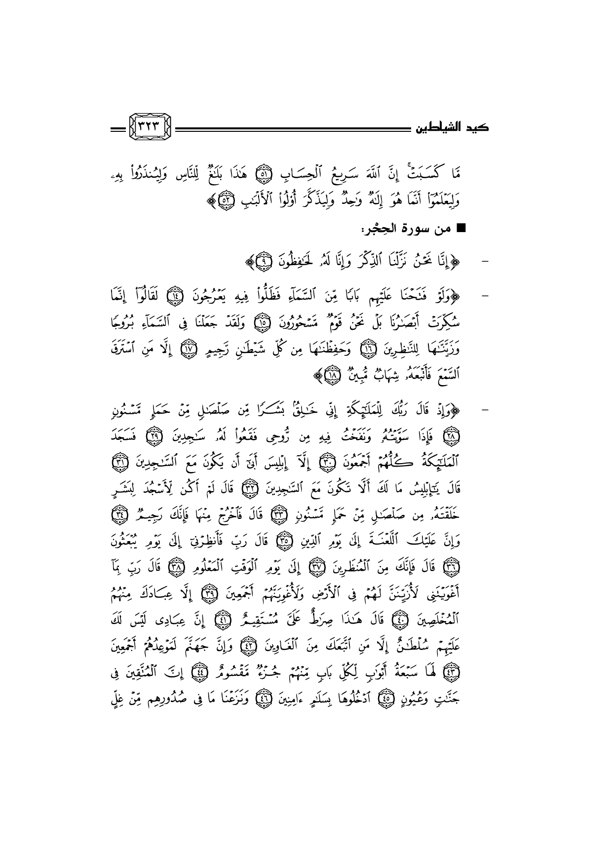 - ... {وَإِذْ قَالَ رَبُّكَ لِلْمَلاَئِكَةِ إِنِّي خَالِقٌ بَشَرًا مِنْ صَلْصَالٍ مِنْ حَمَإٍ مَسْنُونٍ *فَإِذَا سَوَّيْتُهُ وَنَفَخْتُ فِيهِ مِنْ رُوحِي فَقَعُوا لَهُ سَاجِدِينَ *فَسَجَدَ الْمَلاَئِكَةُ كُلُّهُمْ أَجْمَعُونَ *إِلاَّ إِبْلِيسَ أَبَى أَنْ يَكُونَ مَعَ السَّاجِدِينَ *قَالَ يَاإِبْلِيسُ مَا لَكَ أَلاَّ تَكُونَ مَعَ السَّاجِدِينَ *قَالَ لَمْ أَكُنْ لأَِسْجُدَ لِبَشَرٍ خَلَقْتَهُ مِنْ صَلْصَالٍ مِنْ حَمَإٍ مَسْنُونٍ *قَالَ فَاخْرُجْ مِنْهَا فَإِنَّكَ رَجِيمٌ *وَإِنَّ عَلَيْكَ اللَّعْنَةَ إِلَى يَوْمِ الدِّينِ *قَالَ رَبِّ فَأَنْظِرْنِي إِلَى يَوْمِ يُبْعَثُونَ *قَالَ فَإِنَّكَ مِنَ الْمُنْظَرِينَ *إِلَى يَوْمِ الْوَقْتِ الْمَعْلُومِ *قَالَ رَبِّ بِمَا أَغْوَيْتَنِي لأَُزَيِّنَنَّ لَهُمْ فِي الأَرْضِ وَلأَُغْوِيَنَّهُمْ أَجْمَعِينَ *إِلاَّ عِبَادَكَ مِنْهُمُ الْمُخْلَصِينَ *قَالَ هَذَا صِرَاطٌ عَلَيَّ مُسْتَقِيمٌ *إِنَّ عِبَادِي لَيْسَ لَكَ عَلَيْهِمْ سُلْطَانٌ إِلاَّ مَنِ اتَّبَعَكَ مِنَ الْغَاوِينَ *وَإِنَّ جَهَنَّمَ لَمَوْعِدُهُمْ أَجْمَعِينَ *لَهَا سَبْعَةُ أَبْوَابٍ لِكُلِّ بَابٍ مِنْهُمْ جُزْءٌ مَقْسُومٌ *إِنَّ الْمُتَّقِينَ فِي جَنَّاتٍ وَعُيُونٍ *ادْخُلُوهَا بِسَلاَمٍ آمِنِينَ *وَنَزَعْنَا مَا فِي صُدُورِهِمْ مِنْ غِلٍّ
