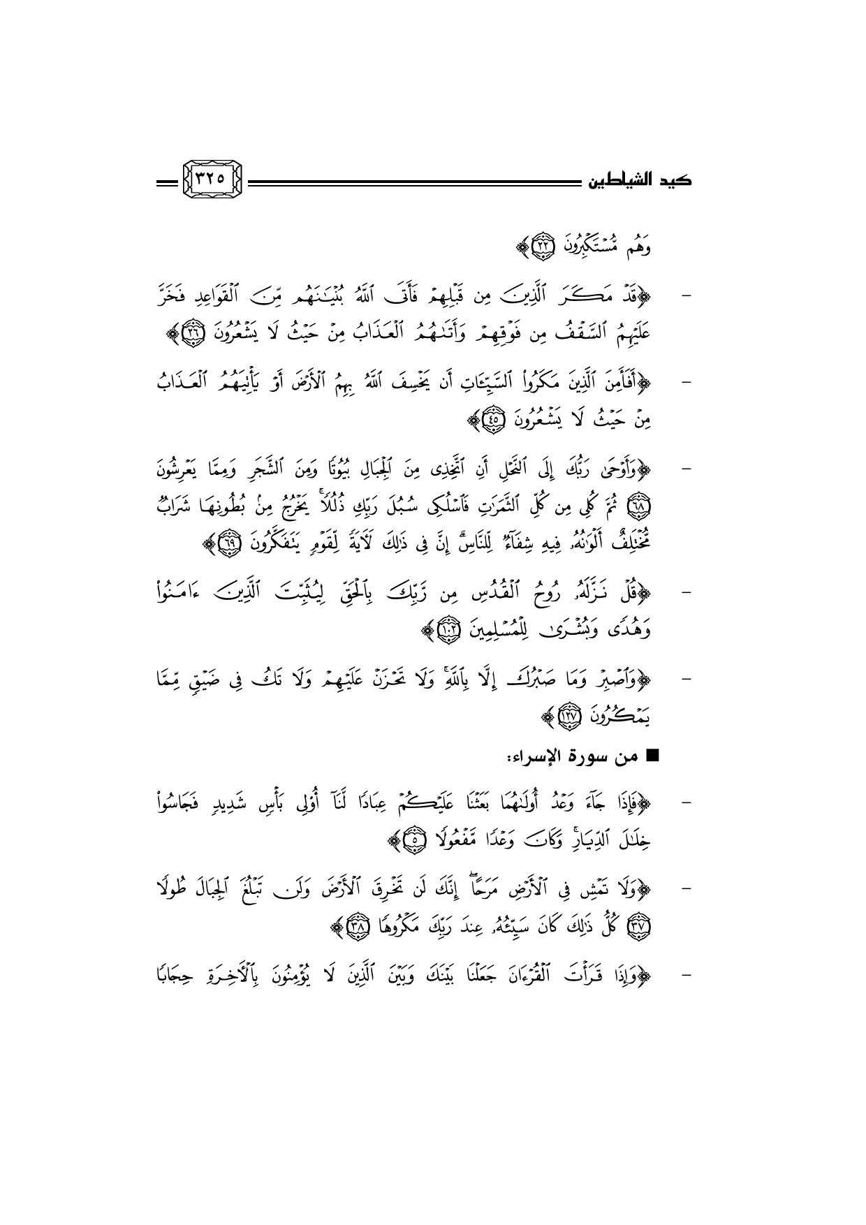 - ... {أَفَأَمِنَ الَّذِينَ مَكَرُوا السَّيِّئَاتِ أَنْ يَخْسِفَ اللَّهُ بِهِمُ الأَرْضَ أَوْ يَأْتِيَهُمُ الْعَذَابُ مِنْ حَيْثُ لاَ يَشْعُرُونَ *}