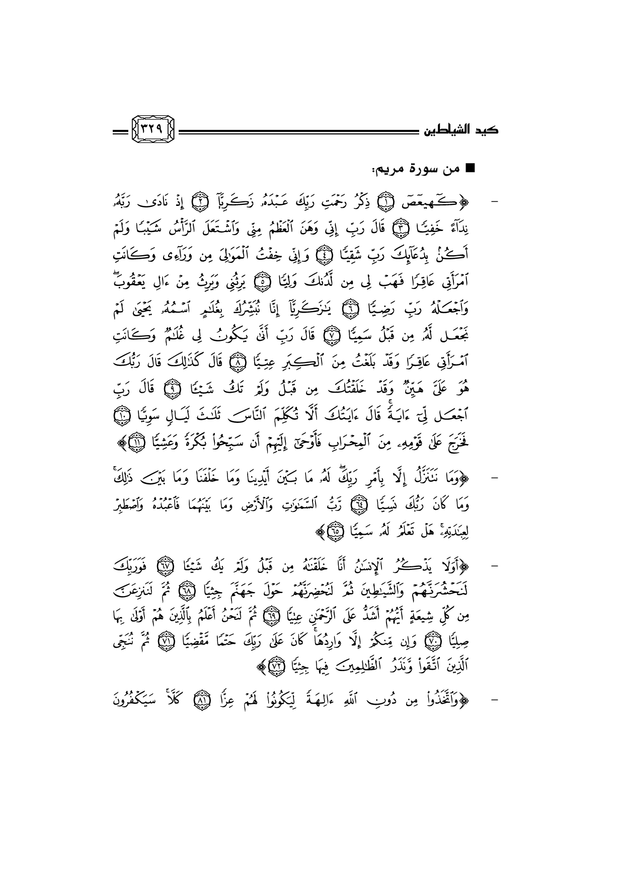 - ... {كهيعص *ذِكْرُ رَحْمَةِ رَبِّكَ عَبْدَهُ زَكَرِيَّا *إِذْ نَادَى رَبَّهُ نِدَاءً خَفِيًّا *قَالَ رَبِّ إِنِّي وَهَنَ الْعَظْمُ مِنِّي وَاشْتَعَلَ الرَّأْسُ شَيْبًا وَلَمْ أَكُنْ بِدُعَائِكَ رَبِّ شَقِيًا *وَإِنِّي خِفْتُ الْمَوَالِيَ مِنْ وَرَائِي وَكَانَتِ امْرَأَتِي عَاقِرًا فَهَبْ لِي مِنْ لَدُنْكَ وَلِيًّا *يَرِثُنِي وَيَرِثُ مِنْ آلِ يَعْقُوبَ وَاجْعَلْهُ رَبِّ رَضِيًّا *يَازَكَريَا إِنَّا نُبَشِّرُكَ بِغُلاَمٍ اسْمُهُ يَحْيَى لَمْ نَجْعَلْ لَهُ مِنْ قَبْلُ سَمِيًّا *قَالَ رَبِّ أَنَّى يَكُونُ لِي غُلاَمٌ وَكَانَتِ امْرَأَتِي عَاقِرًا وَقَدْ بَلَغْتُ مِنَ الْكِبَرِ عِتِيًّا *قَالَ كَذَلِكَ قَالَ رَبُّكَ هُوَ عَلَيَّ هَيِّنٌ وَقَدْ خَلَقْتُكَ مِنْ قَبْلُ وَلَمْ تَكُ شَيْئًا *قَالَ رَبِّ اجْعَلْ لِي آيَةً قَالَ آيَتُكَ أَلاَّ تُكَلِّمَ النَّاسَ ثَلاَثَ لَيَالٍ سَوِيًّا *فَخَرَجَ عَلَى قَوْمِهِ مِنَ الْمِحْرَابِ فَأَوْحَى إِلَيْهِمْ أَنْ سَبِّحُوا بُكْرَةً وَعَشِيًّا *}