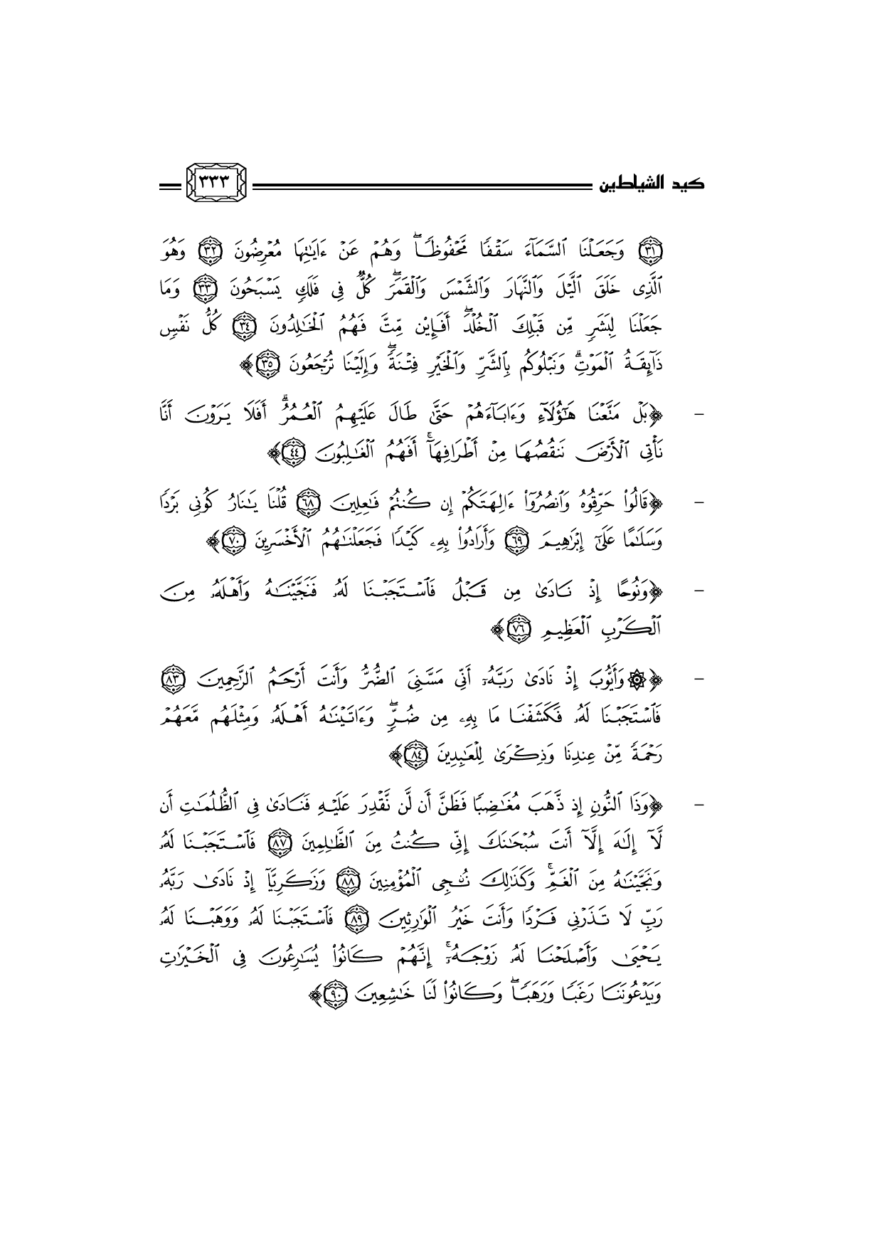 وَجَعَلْنَا السَّمَاءَ سَقْفًا مَحْفُوظًا وَهُمْ عَنْ آيَاتِهَا مُعْرِضُونَ *وَهُوَ الَّذِي خَلَقَ اللَّيْلَ وَالنَّهَارَ وَالشَّمْسَ وَالْقَمَرَ كُلٌّ فِي فَلَكٍ يَسْبَحُونَ *وَمَا جَعَلْنَا لِبَشَرٍ مِنْ قَبْلِكَ الْخُلْدَ أَفَإِنْ مِتَّ فَهُمُ الْخَالِدُونَ *كُلُّ نَفْسٍ ذَائِقَةُ الْمَوْتِ وَنَبْلُوكُمْ بِالشَّرِّ وَالْخَيْرِ فِتْنَةً وَإِلَيْنَا تُرْجَعُونَ *}
