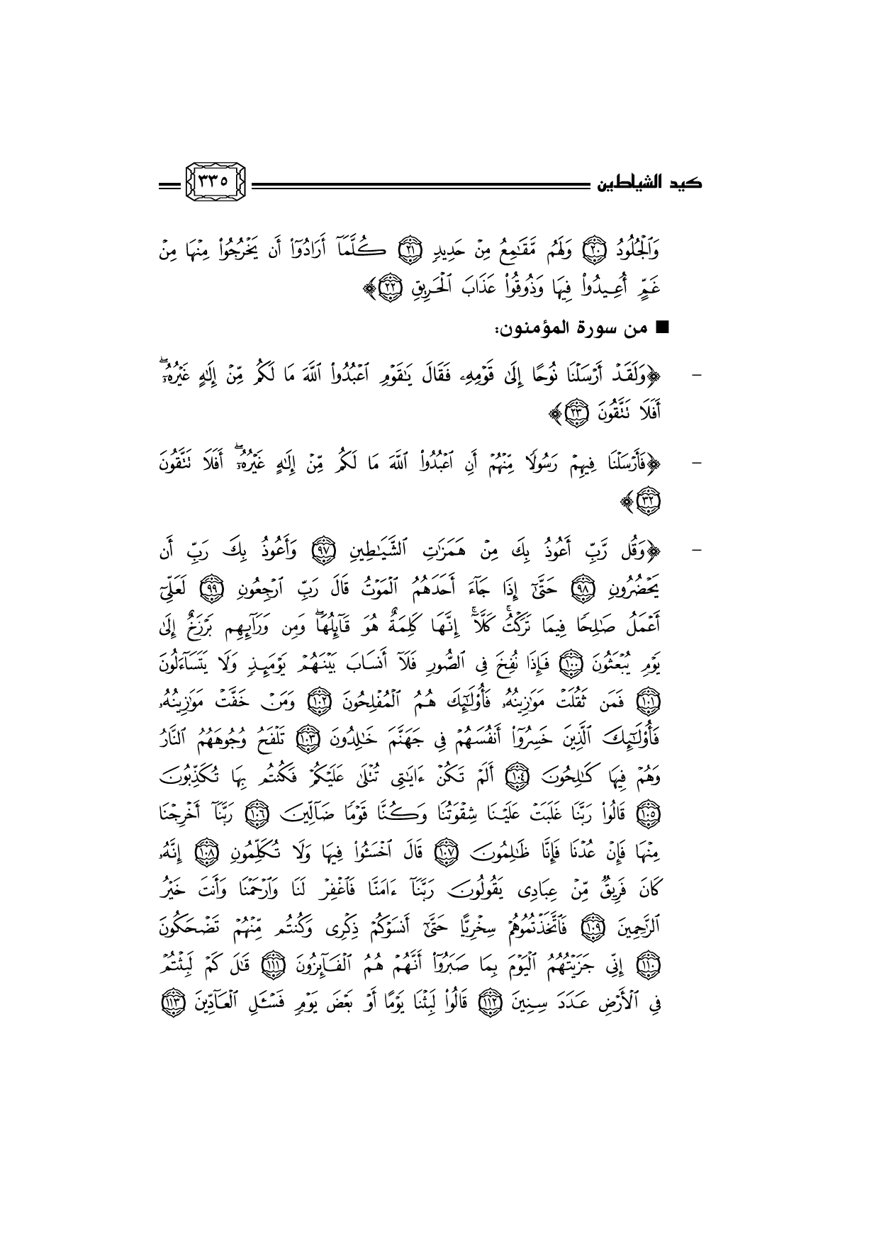 - ... {وَقُلْ رَبِّ أَعُوذُ بِكَ مِنْ هَمَزَاتِ الشَّيَاطِينِ *وَأَعُوذُ بِكَ رَبِّ أَنْ يَحْضُرُونِ *حَتَّى إِذَا جَاءَ أَحَدَهُمُ الْمَوْتُ قَالَ رَبِّ ارْجِعُونِ *لَعَلِّي أَعْمَلُ صَالِحًا فِيمَا تَرَكْتُ كَلاَّ إِنَّهَا كَلِمَةٌ هُوَ قَائِلُهَا وَمِنْ وَرَائِهِمْ بَرْزَخٌ إِلَى يَوْمِ يُبْعَثُونَ *فَإِذَا نُفِخَ فِي الصُّورِ فَلاَ أَنْسَابَ بَيْنَهُمْ يَوْمَئِذٍ وَلاَ يَتَسَاءَلُونَ *فَمَنْ ثَقُلَتْ مَوَازِينُهُ فَأُولَئِكَ هُمُ الْمُفْلِحُونَ *وَمَنْ خَفَّتْ مَوَازِينُهُ فَأُولَئِكَ الَّذِينَ خَسِرُوا أَنْفُسَهُمْ فِي جَهَنَّمَ خَالِدُونَ *تَلْفَحُ وُجُوهَهُمُ النَّارُ وَهُمْ فِيهَا كَالِحُونَ *أَلَمْ تَكُنْ آيَاتِي تُتْلَى عَلَيْكُمْ فَكُنْتُمْ بِهَا تُكَذِّبُونَ *قَالُوا رَبَّنَا غَلَبَتْ عَلَيْنَا شِقْوَتُنَا وَكُنَّا قَوْمًا ضَآلِّينَ *رَبَّنَا أَخْرِجْنَا مِنْهَا فَإِنْ عُدْنَا فَإِنَّا ظَالِمُونَ *قَالَ اخْسَأُوا فِيهَا وَلاَ تُكَلِّمُونِ *إِنَّهُ كَانَ فَرِيقٌ مِنْ عِبَادِي يَقُولُونَ رَبَّنَا آمَنَّا فَاغْفِرْ لَنَا وَارْحَمْنَا وَأَنْتَ خَيْرُ الرَّاحِمِينَ *فَاتَّخَذْتُمُوهُمْ سِخْرِيًّا حَتَّى أَنْسَوْكُمْ ذِكْرِي وَكُنْتُمْ مِنْهُمْ تَضْحَكُونَ *إِنِّي جَزَيْتُهُمُ الْيَوْمَ بِمَا صَبَرُوا أَنَّهُمْ هُمُ الْفَائِزُونَ *قَالَ كَمْ لَبِثْتُمْ فِي الأَرْضِ عَدَدَ سِنِينَ *قَالُوا لَبِثْنَا يَوْمًا أَوْ بَعْضَ يَوْمٍ فَاسْأَلِ الْعَآدِّين