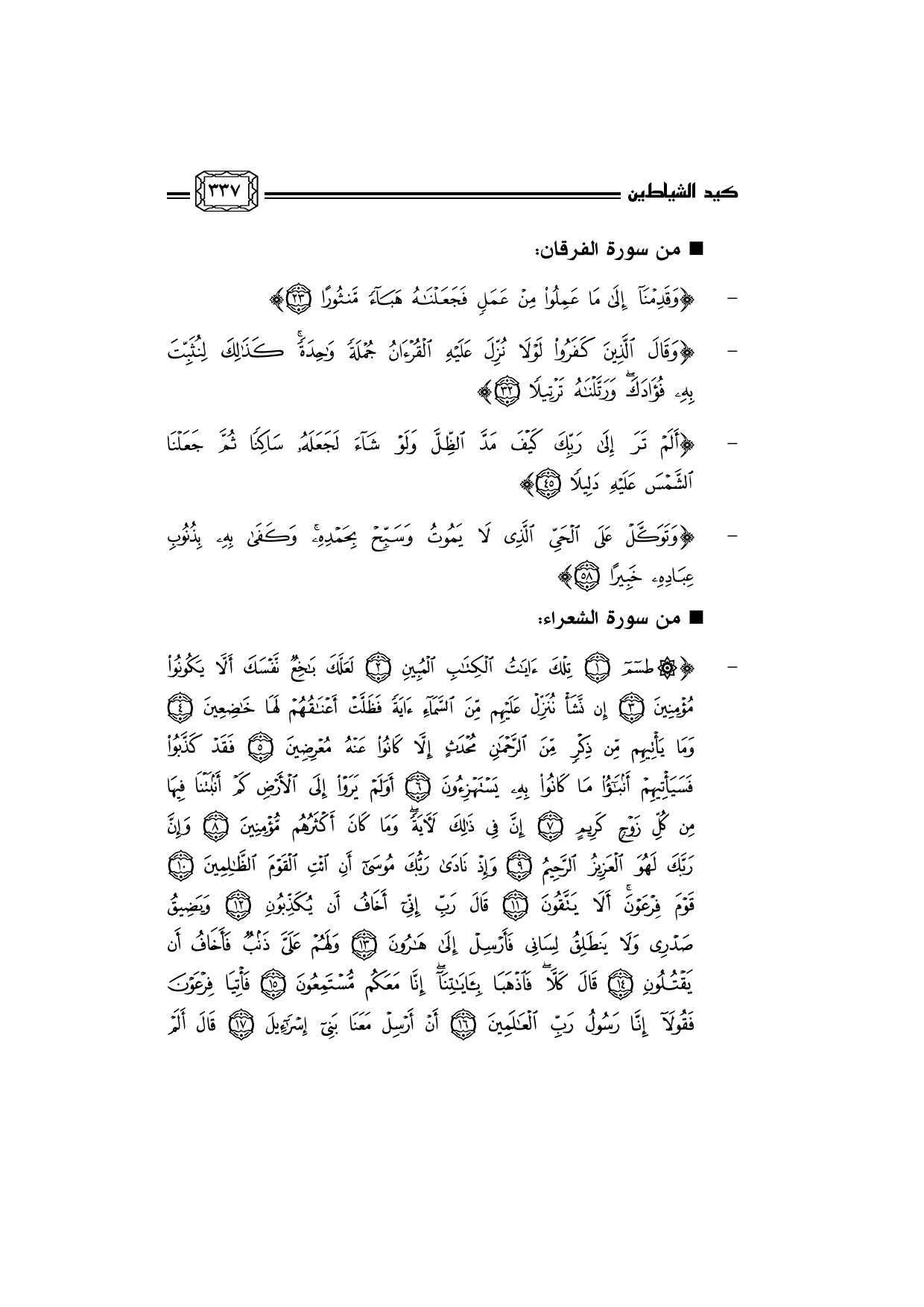 - ... {طسم *تِلْكَ آيَاتُ الْكِتَابِ الْمُبِينِ *لَعَلَّكَ بَاخِعٌ نَفْسَكَ أَلاَّ يَكُونُوا مُؤْمِنِينَ *إِنْ نَشَأْ نُنَزِّلْ عَلَيْهِمْ مِنَ السَّمَاءِ آيَةً فَظَلَّتْ أَعْنَاقُهُمْ لَهَا خَاضِعِينَ *وَمَا يَأْتِيهِمْ مِنْ ذِكْرٍ مِنَ الرَّحْمَانِ مُحْدَثٍ إِلاَّ كَانُوا عَنْهُ مُعْرِضِينَ *فَقَدْ كَذَّبُوا فَسَيَأْتِيهِمْ أَنْبَاءُ مَا كَانُوا بِهِ يَسْتَهْزِئُونَ *أَوَلَمْ يَرَوْا إِلَى الأَرْضِ كَمْ أَنْبَتْنَا فِيهَا مِنْ كُلِّ زَوْجٍ كَرِيمٍ *إِنَّ فِي ذَلِكَ لآَيَةً وَمَا كَانَ أَكْثَرُهُمْ مُؤْمِنِينَ *وَإِنَّ رَبَّكَ لَهُوَ الْعَزِيزُ الرَّحِيمُ *وَإِذْ نَادَى رَبُّكَ مُوسَى أَنِ ائْتِ الْقَوْمَ الظَّالِمِينَ *قَوْمَ فِرْعَوْنَ أَلاَ يَتَّقُونَ *قَالَ رَبِّ إِنِّي أَخَافُ أَنْ يُكَذِّبُونِ *وَيَضِيقُ صَدْرِي وَلاَ يَنْطَلِقُ لِسَانِي فَأَرْسِلْ إِلَى هَارُونَ *وَلَهُمْ عَلَيَّ ذَنْبٌ فَأَخَافُ أَنْ يَقْتُلُونِ *قَالَ كَلاَّ فَاذْهَبَا بِآيَاتِنَا إِنَّا مَعَكُمْ مُسْتَمِعُونَ *فَأْتِيَا فِرْعَوْنَ فَقُولاَ إِنَّا رَسُولُ رَبِّ الْعَالَمِينَ *أَنْ أَرْسِلْ مَعَنَا بَنِي إِسْرَائِيلَ *قَالَ أَلَمْ