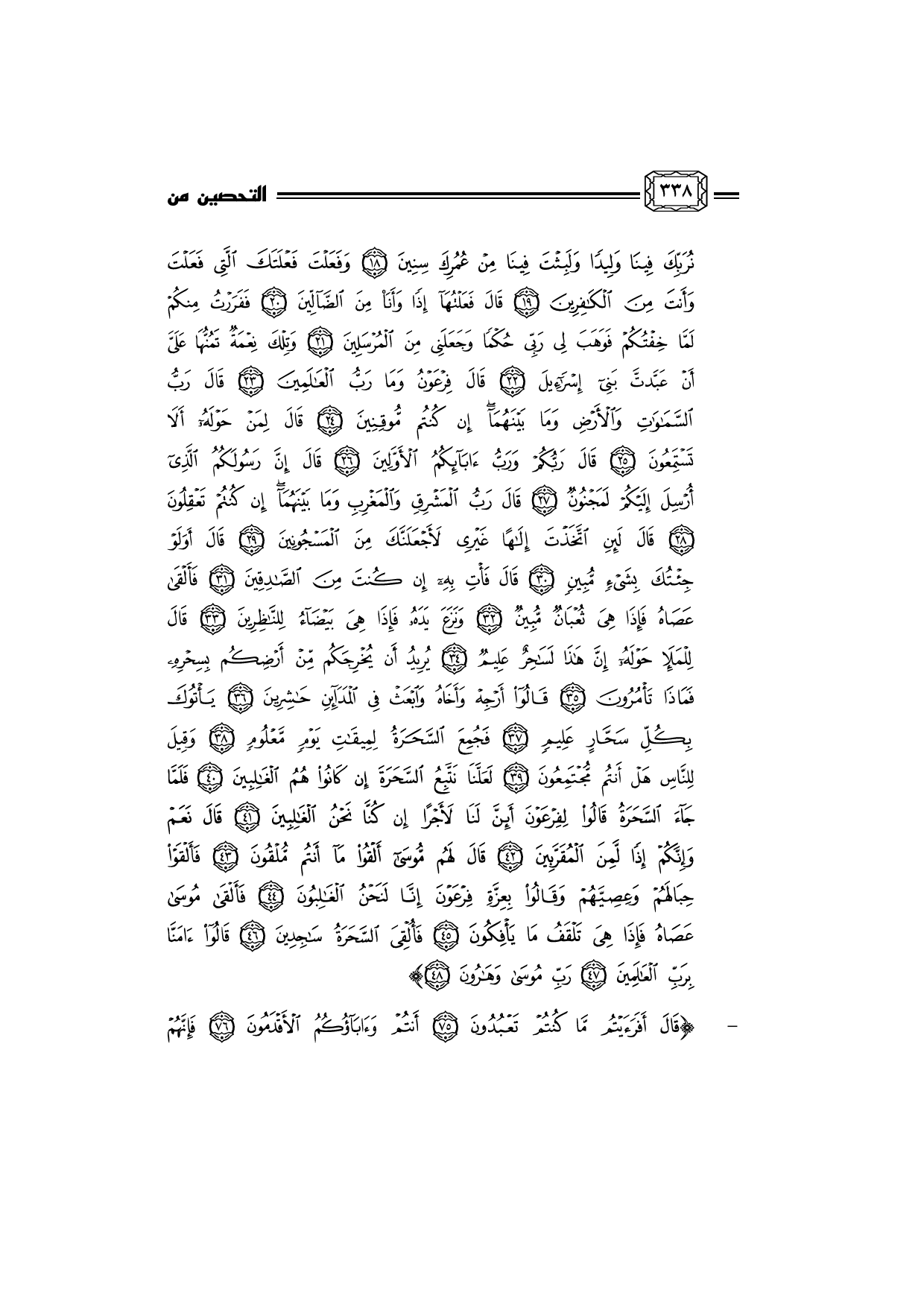 نُرَبِّكَ فِينَا وَلِيدًا وَلَبِثْتَ فِينَا مِنْ عُمُرِكَ سِنِينَ *وَفَعَلْتَ فَعْلَتَكَ الَّتِي فَعَلْتَ وَأَنْتَ مِنَ الْكَافِرِينَ *قَالَ فَعَلْتُهَا إِذًا وَأَنَا مِنَ الضَّآلِّينَ *فَفَرَرْتُ مِنْكُمْ لَمَّا خِفْتُكُمْ فَوَهَبَ لِي رَبِّي حُكْمًا وَجَعَلَنِي مِنَ الْمُرْسَلِينَ *وَتِلْكَ نِعْمَةٌ تَمُنُّهَا عَلَيَّ أَنْ عَبَّدْتَّ بَنِي إِسْرَائِيلَ *قَالَ فِرْعَوْنُ وَمَا رَبُّ الْعَالَمِينَ *قَالَ رَبُّ السَّمَاوَاتِ وَالأَرْضِ وَمَا بَيْنَهُمَا إِنْ كُنْتُمْ مُوقِنِينَ *قَالَ لِمَنْ حَوْلَهُ أَلاَ تَسْتَمِعُونَ *قَالَ رَبُّكُمْ وَرَبُّ آبَائِكُمُ الأَوَّلِينَ *قَالَ