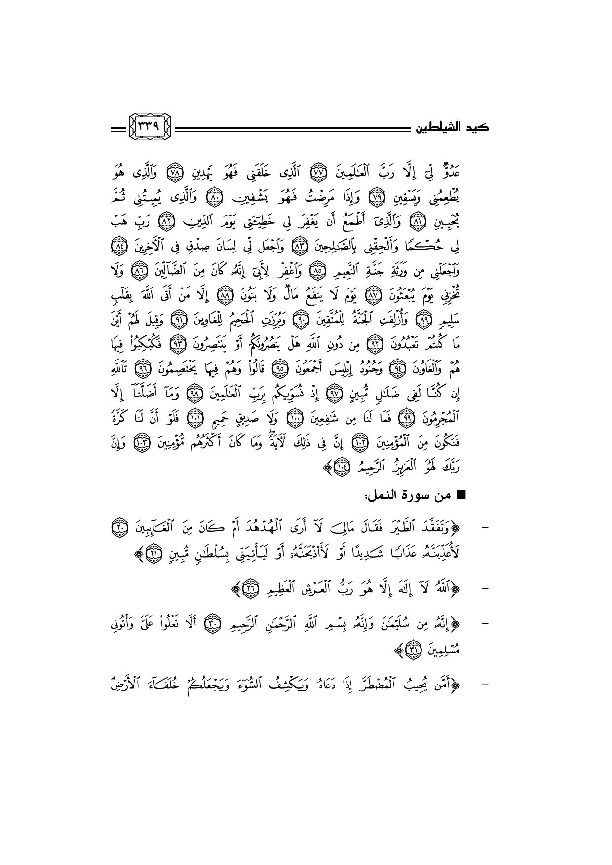 عَدُوٌّ لِي إِلاَّ رَبَّ الْعَالَمِينَ *الَّذِي خَلَقَنِي فَهُوَ يَهْدِينِ *وَالَّذِي هُوَ يُطْعِمُنِي وَيَسْقِينِ *وَإِذَا مَرِضْتُ فَهُوَ يَشْفِينِ *وَالَّذِي يُمِيتُنِي ثُمَّ يُحْيِينِ *وَالَّذِي أَطْمَعُ أَنْ يَغْفِرَ لِي خَطِيئَتِي يَوْمَ الدِّينِ *رَبِّ هَبْ لِي حُكْمًا وَأَلْحِقْنِي بِالصَّالِحِينَ *وَاجْعَلْ لِي لِسَانَ صِدْقٍ فِي الآخِرِينَ *وَاجْعَلْنِي مِنْ وَرَثَةِ جَنَّةِ النَّعِيمِ *وَاغْفِرْ لأَِبِي إِنَّهُ كَانَ مِنَ الضَّآلِّينَ *وَلاَ تُخْزِنِي يَوْمَ يُبْعَثُونَ *يَوْمَ لاَ يَنْفَعُ مَالٌ وَلاَ بَنُونَ *إِلاَّ مَنْ أَتَى اللَّهَ بِقَلْبٍ سَلِيمٍ *وَأُزْلِفَتِ الْجَنَّةُ لِلْمُتَّقِينَ *وَبُرِّزَتِ الْجَحِيمُ لِلْغَاوِينَ *وَقِيلَ لَهُمْ أَيْنَ مَا كُنْتُمْ تَعْبُدُونَ *مِنْ دُونِ اللَّهِ هَلْ يَنْصُرُونَكُمْ أَوْ يَنْتَصِرُونَ *فَكُبْكِبُوا فِيهَا هُمْ وَالْغَاوُونَ *وَجُنُودُ إِبْلِيسَ أَجْمَعُونَ *قَالُوا وَهُمْ فِيهَا يَخْتَصِمُونَ *تاللَّهِ إِنْ كُنَّا لَفِي ضَلاَلٍ مُبِينٍ *إِذْ نُسَوِّيكُمْ بِرَبِّ الْعَالَمِينَ *وَمَا أَضَلَّنَا إِلاَّ الْمُجْرِمُونَ *فَمَا لَنَا مِنْ شَافِعِينَ *وَلاَ صَدِيقٍ حَمِيمٍ *فَلَوْ أَنَّ لَنَا كَرَّةً فَنَكُونَ مِنَ الْمُؤْمِنِينَ *إِنَّ فِي ذَلِكَ لآَيَةً وَمَا كَانَ أَكْثَرُهُمْ مُؤْمِنِينَ *وَإِنَّ رَبَّكَ لَهُوَ الْعَزِيزُ الرَّحِيمُ *}