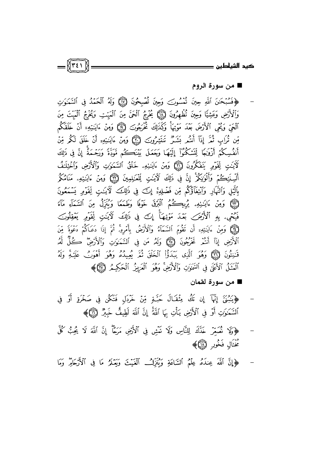 - ... {فَسُبْحَانَ اللَّهِ حِينَ تُمْسُونَ وَحِينَ تُصْبِحُونَ *وَلَهُ الْحَمْدُ فِي السَّمَاوَاتِ وَالأَْرْضِ وَعَشِيًّا وَحِينَ تُظْهِرُونَ *يُخْرِجُ الْحَيَّ مِنَ الْمَيِّتِ وَيُخْرِجُ الْمَيِّتَ مِنَ الْحَيِّ وَيُحْيِي الأَْرْضَ بَعْدَ مَوْتِهَا وَكَذَلِكَ تُخْرَجُونَ *وَمِنْ آيَاتِهِ أَنْ خَلَقَكُمْ مِنْ تُرَابٍ ثُمَّ إِذَا أَنْتُمْ بَشَرٌ تَنْتَشِرُونَ *وَمِنْ آيَاتِهِ أَنْ خَلَقَ لَكُمْ مِنْ أَنْفُسِكُمْ أَزْوَاجًا لِتَسْكُنُوا إِلَيْهَا وَجَعَلَ بَيْنَكُمْ مَوَدَّةً وَرَحْمَةً إِنَّ فِي ذَلِكَ لآَيَاتٍ لِقَوْمٍ يَتَفَكَّرُونَ *وَمِنْ آيَاتِهِ خَلْقُ السَّمَاوَاتِ وَالأَْرْضِ وَاخْتِلاَفُ أَلْسِنَتِكُمْ وَأَلْوَانِكُمْ إِنَّ فِي ذَلِكَ لآَيَاتٍ لِلْعَالِمِينَ *وَمِنْ آيَاتِهِ مَنَامُكُمْ بِاللَّيْلِ وَالنَّهَارِ وَابْتِغَاؤُكُمْ مِنْ فَضْلِهِ إِنَّ فِي ذَلِكَ لآَيَاتٍ لِقَوْمٍ يَسْمَعُونَ *وَمِنْ آيَاتِهِ يُرِيكُمُ الْبَرْقَ خَوْفًا وَطَمَعًا وَيُنَزِّلُ مِنَ السَّمَاءِ مَاءً فَيُحْيِي بِهِ الأَْرْضَ بَعْدَ مَوْتِهَا إِنَّ فِي ذَلِكَ لآَيَاتٍ لِقَوْمٍ يَعْقِلُونَ *وَمِنْ آيَاتِهِ أَنْ تَقُومَ السَّمَاءُ وَالأَْرْضُ بِأَمْرِهِ ثُمَّ إِذَا دَعَاكُمْ دَعْوَةً مِنَ الأَْرْضِ إِذَا أَنْتُمْ تَخْرُجُونَ *وَلَهُ مَنْ فِي السَّمَاوَاتِ وَالأَْرْضِ كُلٌّ لَهُ قَانِتُونَ *وَهُوَ الَّذِي يَبْدَأُ الْخَلْقَ ثُمَّ يُعِيدُهُ وَهُوَ أَهْوَنُ عَلَيْهِ وَلَهُ الْمَثَلُ الأَْعْلَى فِي السَّمَاوَاتِ وَالأَْرْضِ وَهُوَ الْعَزِيزُ الْحَكِيمُ}