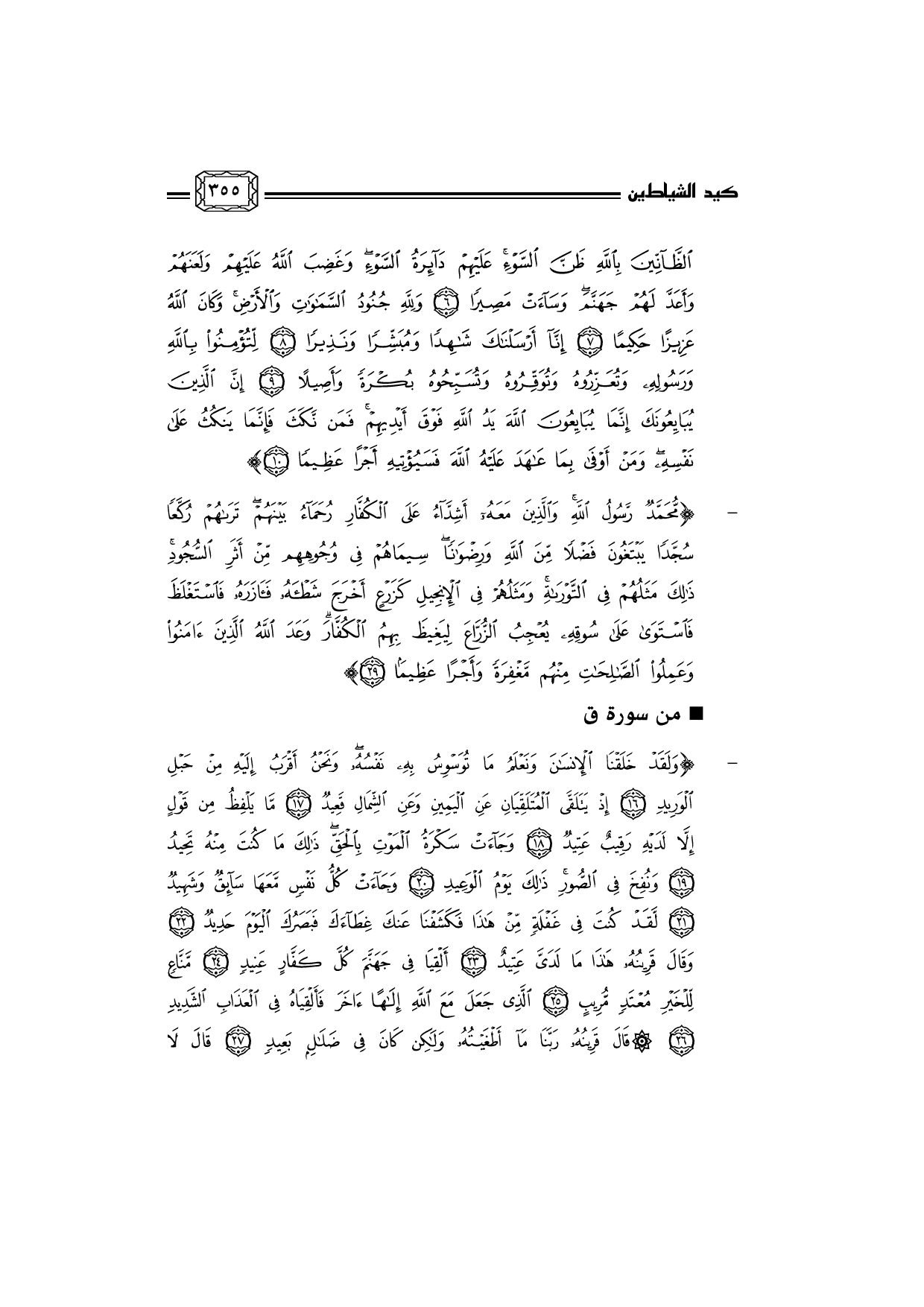الظَّآنِّينَ بِاللَّهِ ظَنَّ السَّوْءِ عَلَيْهِمْ دَائِرَةُ السَّوْءِ وَغَضِبَ اللَّهُ عَلَيْهِمْ وَلَعَنَهُمْ وَأَعَدَّ لَهُمْ جَهَنَّمَ وَسَاءَتْ مَصِيرًا *وَلِلَّهِ جُنُودُ السَّمَاوَاتِ وَالأَْرْضِ وَكَانَ اللَّهُ عَزِيزًا حَكِيمًا *إِنَّا أَرْسَلْنَاكَ شَاهِدًا وَمُبَشِّرًا وَنَذِيرًا *لِتُؤْمِنُوا بِاللَّهِ وَرَسُولِهِ وَتُعَزِّرُوهُ وَتُوَقِّرُوهُ وَتُسَبِّحُوهُ بُكْرَةً وَأَصِيلاً *إِنَّ الَّذِينَ يُبَايِعُونَكَ إِنَّمَا يُبَايِعُونَ اللَّهَ يَدُ اللَّهِ فَوْقَ أَيْدِيهِمْ فَمَنْ نَكَثَ فَإِنَّمَا يَنْكُثُ عَلَى نَفْسِهِ وَمَنْ أَوْفَى بِمَا عَاهَدَ عَلَيْهِ اللَّهَ فَسَيُؤْتِيهِ أَجْرًا عَظِيمًا}