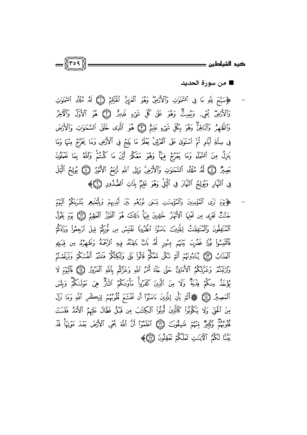 - ... {يَوْمَ تَرَى الْمُؤْمِنِينَ وَالْمُؤْمِنَاتِ يَسْعَى نُورُهُمْ بَيْنَ أَيْدِيهِمْ وَبِأَيْمَانِهِمْ بُشْرَاكُمُ الْيَوْمَ جَنَّاتٌ تَجْرِي مِنْ تَحْتِهَا الأَْنْهَارُ خَالِدِينَ فِيهَا ذَلِكَ هُوَ الْفَوْزُ الْعَظِيمُ *يَوْمَ يَقُولُ الْمُنَافِقُونَ وَالْمُنَافِقَاتُ لِلَّذِينَ آمَنُوا انْظُرُونَا نَقْتَبِسْ مِنْ نُورِكُمْ قِيلَ ارْجِعُوا وَرَاءَكُمْ فَالْتَمِسُوا نُورًا فَضُرِبَ بَيْنَهُمْ بِسُورٍ لَهُ بَابٌ بَاطِنُهُ فِيهِ الرَّحْمَةُ وَظَاهِرُهُ مِنْ قِبَلِهِ الْعَذَابُ *يُنَادُونَهُمْ أَلَمْ نَكُنْ مَعَكُمْ قَالُوا بَلَى وَلَكِنَّكُمْ فَتَنْتُمْ أَنْفُسَكُمْ وَتَرَبَّصْتُمْ وَارْتَبْتُمْ وَغَرَّتْكُمُ الأَْمَانِيُّ حَتَّى جَاءَ أَمْرُ اللَّهِ وَغَرَّكُمْ بِاللَّهِ الْغَرُورُ *فَالْيَوْمَ لاَ يُؤْخَذُ مِنْكُمْ فِدْيَةٌ وَلاَ مِنَ الَّذِينَ كَفَرُوا مَأْوَاكُمُ النَّارُ هِيَ مَوْلاَكُمْ وَبِئْسَ الْمَصِيرُ *أَلَمْ يَأْنِ لِلَّذِينَ آمَنُوا أَنْ تَخْشَعَ قُلُوبُهُمْ لِذِكْرِ اللَّهِ وَمَا نَزَلَ مِنَ الْحَقِّ وَلاَ يَكُونُوا كَالَّذِينَ أُوتُوا الْكِتَابَ مِنْ قَبْلُ فَطَالَ عَلَيْهِمُ الأَْمَدُ فَقَسَتْ قُلُوبُهُمْ وَكَثِيرٌ مِنْهُمْ فَاسِقُونَ *اعْلَمُوا أَنَّ اللَّهَ يُحْيِي الأَْرْضَ بَعْدَ مَوْتِهَا قَدْ بَيَّنَّا لَكُمُ الآْيَاتِ لَعَلَّكُمْ تَعْقِلُونَ}