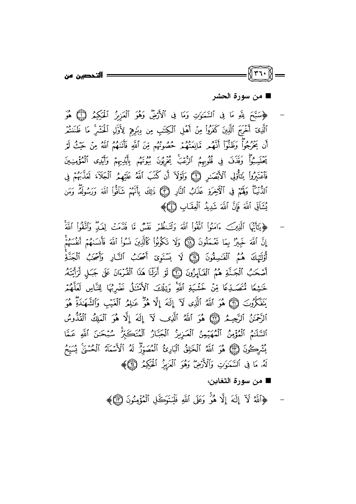 - ... {يَاأَيُّهَا الَّذِينَ آمَنُوا اتَّقُوا اللَّهَ وَلْتَنْظُرْ نَفْسٌ مَا قَدَّمَتْ لِغَدٍ وَاتَّقُوا اللَّهَ إِنَّ اللَّهَ خَبِيرٌ بِمَا تَعْمَلُونَ *وَلاَ تَكُونُوا كَالَّذِينَ نَسُوا اللَّهَ فَأَنْسَاهُمْ أَنْفُسَهُمْ أُولَئِكَ هُمُ الْفَاسِقُونَ *لاَ يَسْتَوِي أَصْحَابُ النَّارِ وَأَصْحَابُ الْجَنَّةِ أَصْحَابُ الْجَنَّةِ هُمُ الْفَائِزُونَ *لَوْ أَنْزَلْنَا هَذَا الْقُرْآنَ عَلَى جَبَلٍ لَرَأَيْتَهُ خَاشِعًا مُتَصَدِّعًا مِنْ خَشْيَةِ اللَّهِ وَتِلْكَ الأَْمْثَالُ نَضْرِبُهَا لِلنَّاسِ لَعَلَّهُمْ يَتَفَكَّرُونَ *هُوَ اللَّهُ الَّذِي لاَ إِلهَ إِلاَّ هُوَ عَالِمُ الْغَيْبِ وَالشَّهَادَةِ هُوَ الرَّحْمَانُ الرَّحِيمُ *هُوَ اللَّهُ الَّذِي لاَ إِلهَ إِلاَّ هُوَ الْمَلِكُ الْقُدُّوسُ السَّلاَمُ الْمُؤْمِنُ الْمُهَيْمِنُ الْعَزِيزُ الْجَبَّارُ الْمُتَكَبِّرُ سُبْحَانَ اللَّهِ عَمَّا يُشْرِكُونَ *هُوَ اللَّهُ الْخَالِقُ الْبَارِىءُ الْمُصَوِّرُ لَهُ الأَْسْمَاءُ الْحُسْنَى يُسَبِّحُ لَهُ مَا فِي السَّمَاوَاتِ وَالأَْرْضِ وَهُوَ الْعَزِيزُ الْحَكِيمُ}