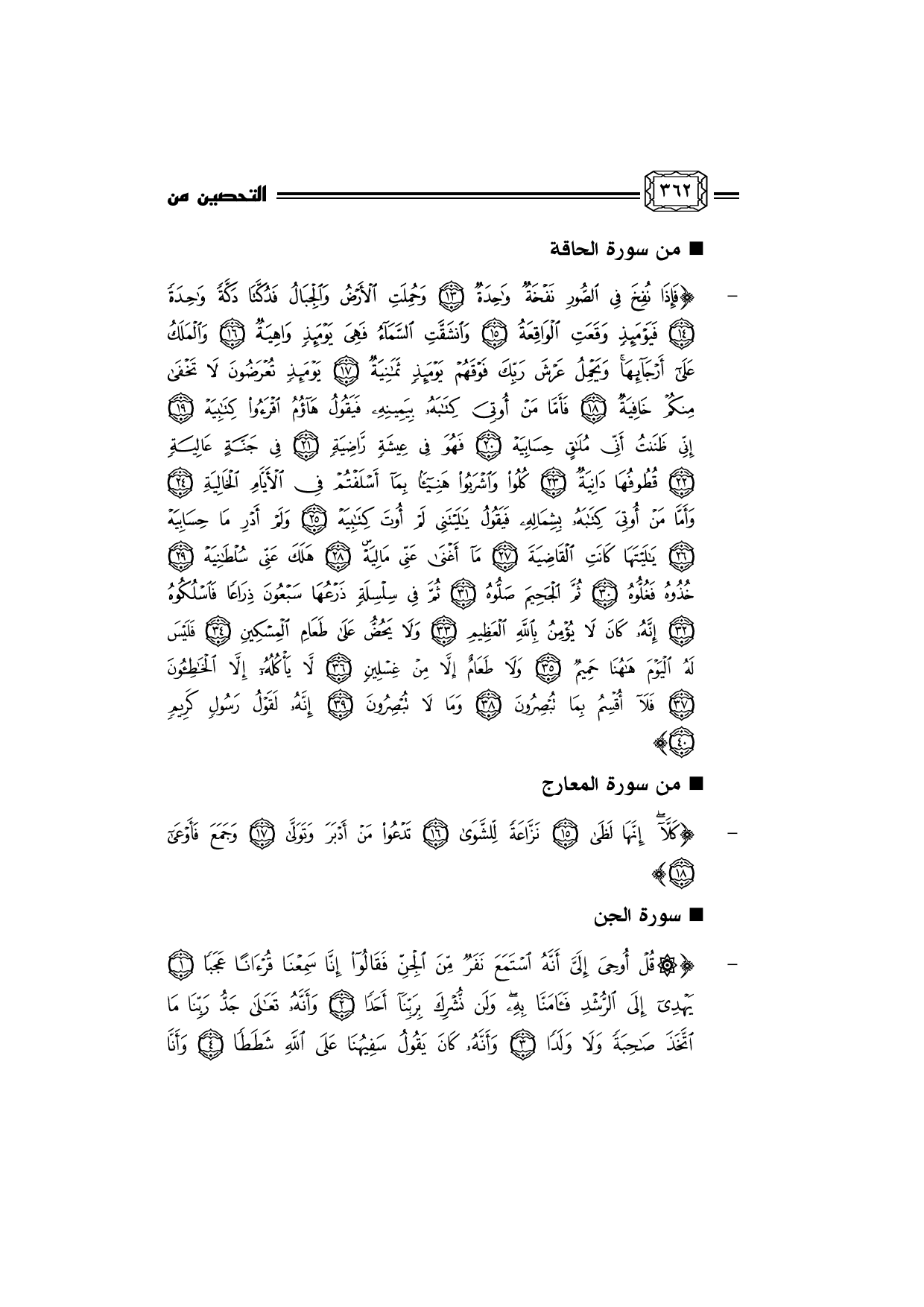 - ... {فَإِذَا نُفِخَ فِي الصُّورِ نَفْخَةٌ وَاحِدَةٌ *وَحُمِلَتِ الأَْرْضُ وَالْجِبَالُ فَدُكَّتَا دَكَّةً وَاحِدَةً *فَيَوْمَئِذٍ وَقَعَتِ الْوَاقِعَةُ *وَانْشَقَّتِ السَّمَاءُ فَهِيَ يَوْمَئِذٍ وَاهِيَةٌ *وَالْمَلَكُ عَلَى أَرْجَائِهَا وَيَحْمِلُ عَرْشَ رَبِّكَ فَوْقَهُمْ يَوْمَئِذٍ ثَمَانِيَةٌ *يَوْمَئِذٍ تُعْرَضُونَ لاَ تَخْفَى مِنْكُمْ خَافِيَةٌ *فَأَمَّا مَنْ أُوتِيَ كِتَابَهُ بِيَمِينِهِ فَيَقُولُ هَاؤُمُ اقْرَأُوا كِتَابِيَهْ *إِنِّي ظَنَنْتُ أَنِّي مُلاَقٍ حِسَابِيَهْ *فَهُوَ فِي عِيشَةٍ رَاضِيَةٍ *فِي جَنَّةٍ عَالِيَةٍ *قُطُوفُهَا دَانِيَةٌ *كُلُوا وَاشْرَبُوا هَنِيئًا بِمَا أَسْلَفْتُمْ فِي الأَْيَّامِ الْخَالِيَةِ *وَأَمَّا مَنْ أُوتِيَ كِتَابَهُ بِشِمَالِهِ فَيَقُولُ يَالَيْتَنِي لَمْ أُوتَ كِتَابِيَهْ *وَلَمْ أَدْرِ مَا حِسَابِيَهْ *يَالَيْتَهَا كَانَتِ الْقَاضِيَةَ *مَا أَغْنَى عَنِّي مَالِيَهْ *هَلَكَ عَنِّي سُلْطَانِيَهْ *خُذُوهُ فَغُلُّوهُ *ثُمَّ الْجَحِيمَ صَلُّوهُ *ثُمَّ فِي سِلْسِلَةٍ ذَرْعُهَا سَبْعُونَ ذِرَاعًا فَاسْلُكُوهُ *إِنَّهُ كَانَ لاَ يُؤْمِنُ بِاللَّهِ الْعَظِيمِ *وَلاَ يَحُضُّ عَلَى طَعَامِ الْمِسْكِينِ *فَلَيْسَ لَهُ الْيَوْمَ هَاهُنَا حَمِيمٌ *وَلاَ طَعَامٌ إِلاَّ مِنْ غِسْلِينٍ *لاَ يَأْكُلُهُ إِلاَّ الْخَاطِئُونَ *فَلاَ أُقْسِمُ بِمَا تُبْصِرُونَ *وَمَا لاَ تُبْصِرُونَ *إِنَّهُ لَقَوْلُ رَسُولٍ كَرِيمٍ}