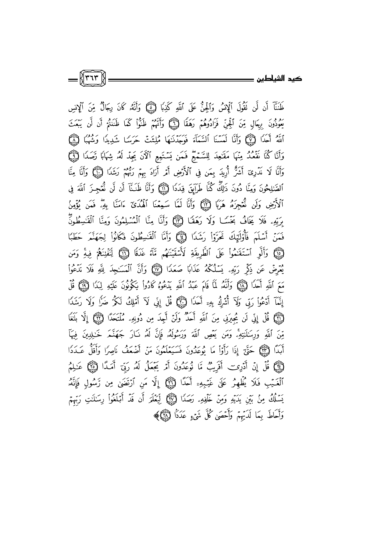 ظَنَنَّا أَنْ لَنْ تَقُولَ الإِْنْسُ وَالْجِنُّ عَلَى اللَّهِ كَذِبًا *وَأَنَّهُ كَانَ رِجَالٌ مِنَ الإِْنْسِ يَعُوذُونَ بِرِجَالٍ مِنَ الْجِنِّ فَزَادُوهُمْ رَهَقًا *وَأَنَّهُمْ ظَنُّوا كَمَا ظَنَنْتُمْ أَنْ لَنْ يَبْعَثَ اللَّهُ أَحَدًا *وَأَنَّا لَمَسْنَا السَّمَاءَ فَوَجَدْنَاهَا مُلِئَتْ حَرَسًا شَدِيدًا وَشُهُبًا *وَأَنَّا كُنَّا نَقْعُدُ مِنْهَا مَقَاعِدَ لِلسَّمْعِ فَمَنْ يَسْتَمِعِ الآْنَ يَجِدْ لَهُ شِهَابًا رَصَدًا *وَأَنَّا لاَ نَدْرِي أَشَرٌّ أُرِيدَ بِمَنْ فِي الأَْرْضِ أَمْ أَرَادَ بِهِمْ رَبُّهُمْ رَشَدًا *وَأَنَّا مِنَّا الصَّالِحُونَ وَمِنَّا دُونَ ذَلِكَ كُنَّا طَرَائِقَ قِدَدًا *وَأَنَّا ظَنَنَّا أَنْ لَنْ نُعْجِزَ اللَّهَ فِي الأَْرْضِ وَلَنْ نُعْجِزَهُ هَرَبًا *وَأَنَّا لَمَّا سَمِعْنَا الْهُدَى آمَنَّا بِهِ فَمَنْ يُؤمِنْ بِرَبِّهِ فَلاَ يَخَافُ بَخْسًا وَلاَ رَهَقًا *وَأَنَّا مِنَّا الْمُسْلِمُونَ وَمِنَّا الْقَاسِطُونَ فَمَنْ أَسْلَمَ فَأُولَئِكَ تَحَرَّوْا رَشَدًا *وَأَمَّا الْقَاسِطُونَ فَكَانُوا لِجَهَنَّمَ حَطَبًا *وَأَلَّوِِ اسْتَقَامُوا عَلَى الطَّرِيقَةِ لأََْسْقَيْنَاهُمْ مَاءً غَدَقًا *لِنَفْتِنَهُمْ فِيهِ وَمَنْ يُعْرِضْ عَنْ ذِكْرِ رَبِّهِ يَسْلُكْهُ عَذَابًا صَعَدًا *وَأَنَّ الْمَسَاجِدَ لِلَّهِ فَلاَ تَدْعُوا مَعَ اللَّهِ أَحَدًا *وَأَنَّهُ لَمَّا قَامَ عَبْدُ اللَّهِ يَدْعُوهُ كَادُوا يَكُونُونَ عَلَيْهِ لِبَدًا