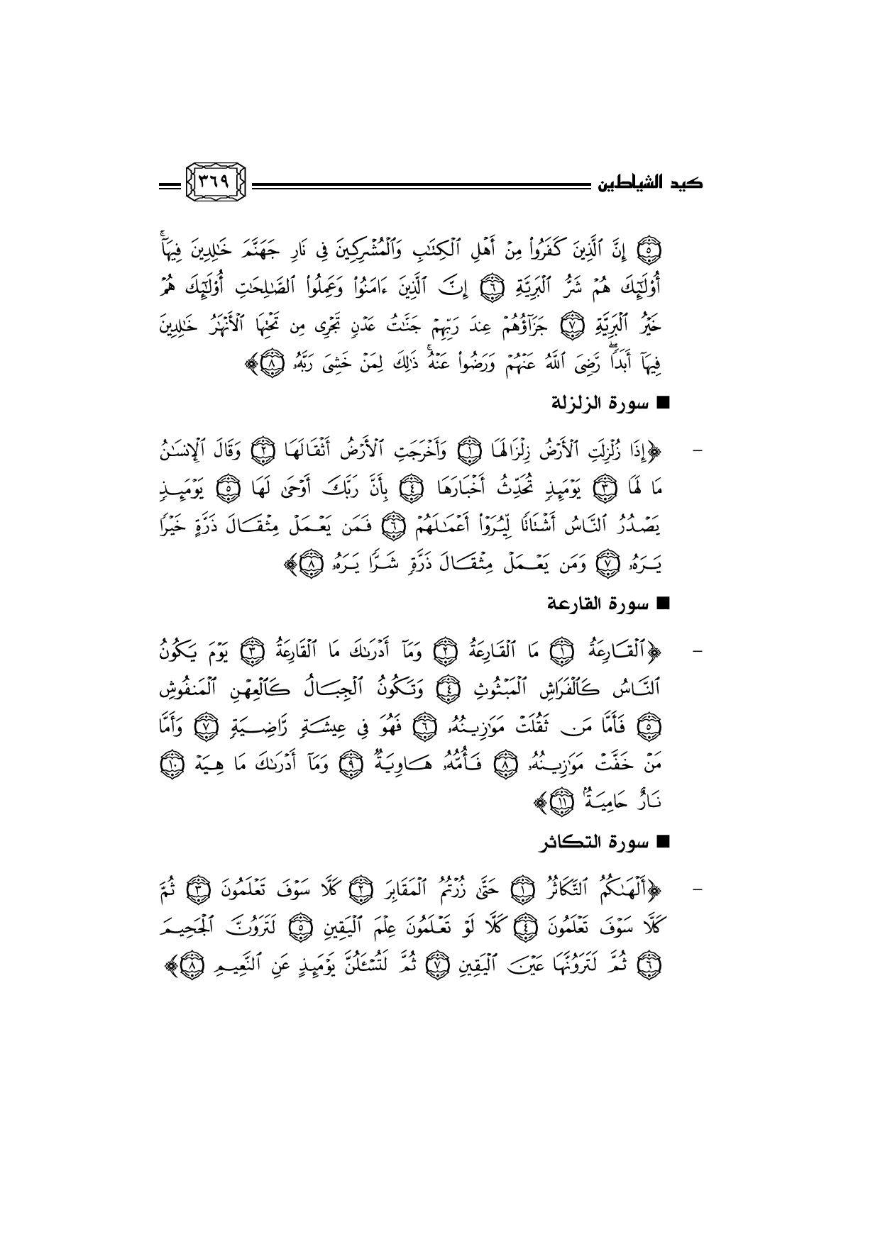 - ... {أَلْهَاكُمُ التَّكَاثُرُ *حَتَّى زُرْتُمُ الْمَقَابِرَ *كَلاَّ سَوْفَ تَعْلَمُونَ *ثُمَّ كَلاَّ سَوْفَ تَعْلَمُونَ *كَلاَّ لَوْ تَعْلَمُونَ عِلْمَ الْيَقِينِ *لَتَرَوُنَّ الْجَحِيمَ *ثُمَّ لَتَرَوُنَّهَا عَيْنَ الْيَقِينِ *ثُمَّ لَتُسْأَلُنَّ يَوْمَئِذٍ عَنِ النَّعِيمِ}