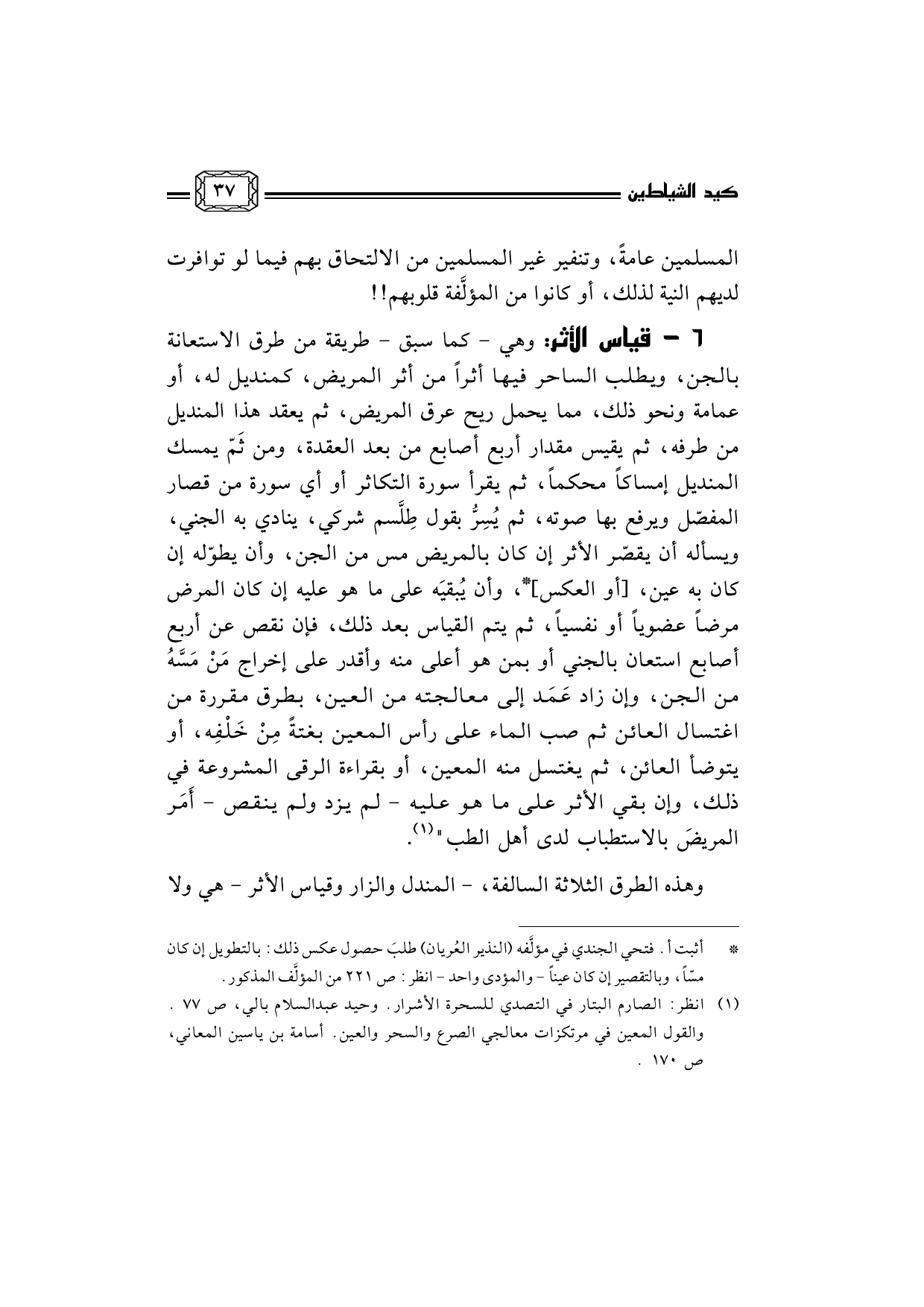 (¬1) انظر: الصارم البتار في التصدي للسحرة الأشرار. وحيد عبد السلام بالي، ص 77. والقول المعين في مرتكزات معالجي الصرع والسحر والعين. أسامة بن ياسين المعاني، ص 170.
