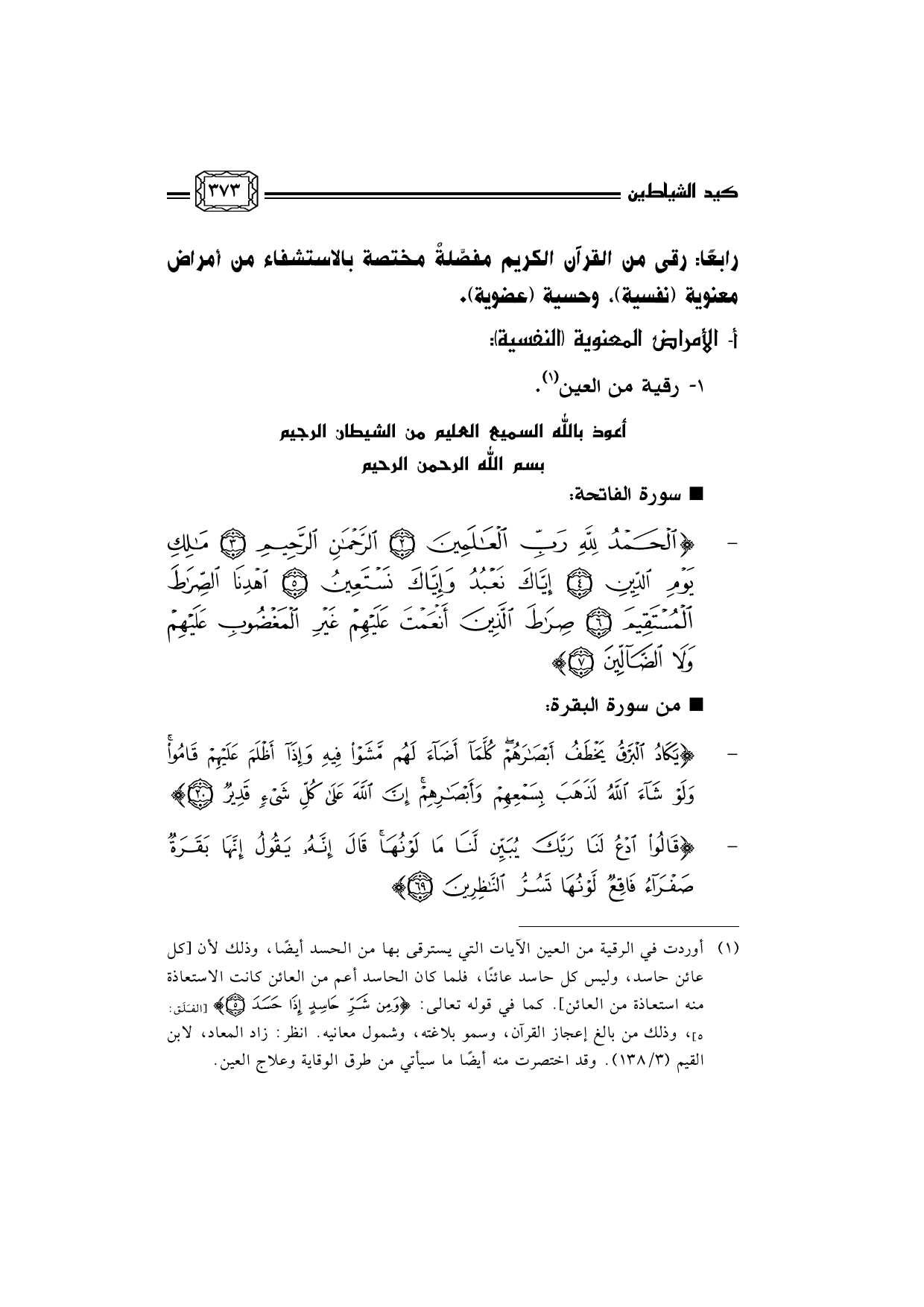 (¬1) أوردت في الرقية من العين الآيات التي يسترقى بها من الحسد أيضًا، وذلك لأن [كل عائن حاسد، وليس كل حاسد عائنًا، فلما كان الحاسد أعم من العائن كانت الاستعاذة منه استعاذة من العائن] . كما في قوله تعالى: [الفَلَق: 5] {وَمِنْ شَرِّ حَاسِدٍ إِذَا حَسَدَ *} ، وذلك من بالغ إعجاز القرآن، وسمو بلاغته، وشمول معانيه. انظر: زاد المعاد، لابن القيم (3/138) . وقد اختصرت منه أيضًا ما سيأتي من طرق الوقاية وعلاج العين.