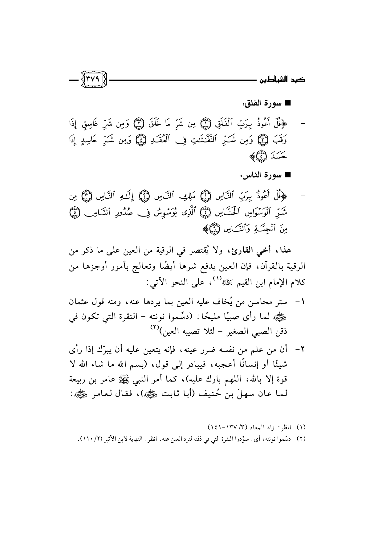 1- ... ستر محاسن من يُخاف عليه العين بما يردها عنه، ومنه قول عثمان رضي الله عنه لما رأى صبيًا مليحًا: (دسِّموا نونته - النقرة التي تكون في ذقن الصبي الصغير - لئلا تصيبه العين) (¬2)