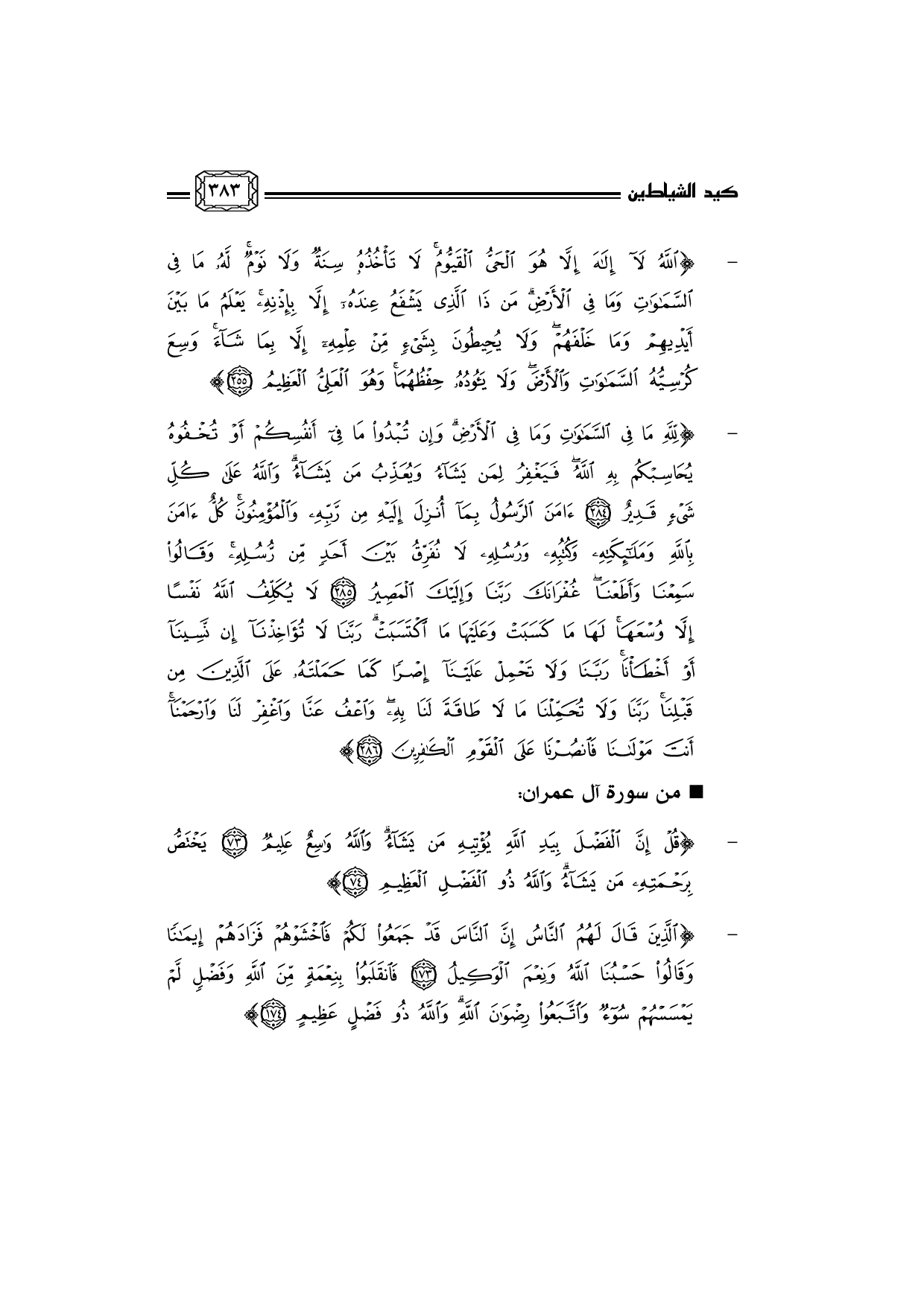 - ... {اللَّهُ لاَ إِلَهَ إِلاَّ هُوَ الْحَيُّ الْقَيُّومُ لاَ تَأْخُذُهُ سِنَةٌ وَلاَ نَوْمٌ لَهُ مَا فِي السَّمَاوَاتِ وَمَا فِي الأَرْضِ مَنْ ذَا الَّذِي يَشْفَعُ عِنْدَهُ إِلاَّ بِإِذْنِهِ يَعْلَمُ مَا بَيْنَ أَيْدِيهِمْ وَمَا خَلْفَهُمْ وَلاَ يُحِيطُونَ بِشَيءٍ مِنْ عِلْمِهِ إِلاَّ بِمَا شَاءَ وَسِعَ كُرْسِيُّهُ السَّمَاوَاتِ وَالأَرْضَ وَلاَ يَؤُودُهُ حِفْظُهُمَا وَهُوَ الْعَلِيُّ الْعَظِيمُ *}