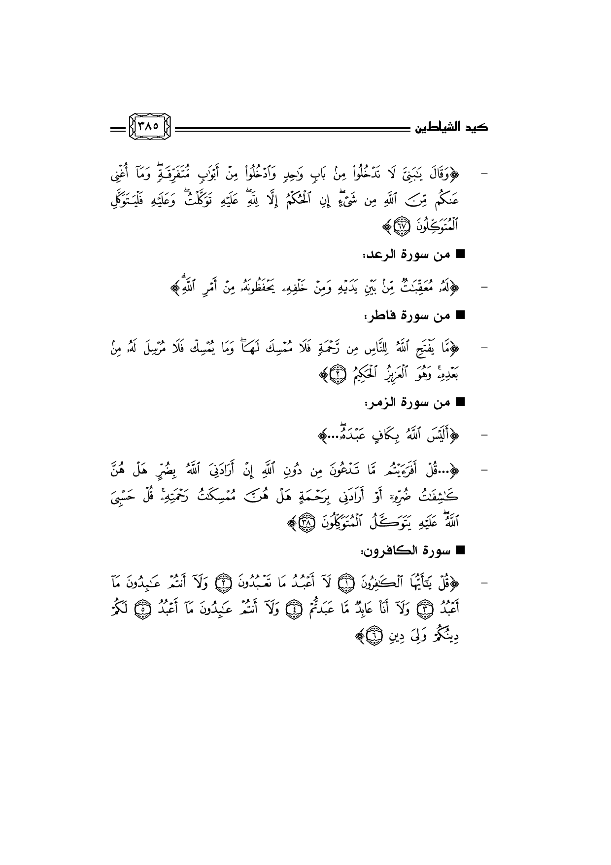 - ... {قُلْ يَاأَيُّهَا الْكَافِرُونَ *لاَ أَعْبُدُ مَا تَعْبُدُونَ *وَلاَ أَنْتُمْ عَابِدُونَ مَا أَعْبُدُ *وَلاَ أَنَا عَابِدٌ مَا عَبَدْتُّمْ *وَلاَ أَنْتُمْ عَابِدُونَ مَا أَعْبُدُ *لَكُمْ دِينُكُمْ وَلِيَ دِينِ *}