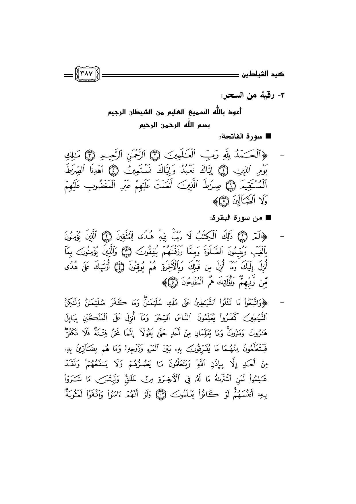 - ... {وَاتَّبَعُوا مَا تَتْلُوا الشَّيَاطِينُ عَلَى مُلْكِ سُلَيْمَانَ وَمَا كَفَرَ سُلَيْمَانُ وَلَكِنَّ الشَّيَاطِينَ كَفَرُوا يُعَلِّمُونَ النَّاسَ السِّحْرَ وَمَا أُنْزِلَ عَلَى الْمَلَكَيْنِ بِبَابِلَ هَارُوتَ وَمَارُوتَ وَمَا يُعَلِّمَانِ مِنْ أَحَدٍ حَتَّى يَقُولاَ إِنَّمَا نَحْنُ فِتْنَةٌ فَلاَ تَكْفُرْ فَيَتَعَلَّمُونَ مِنْهُمَا مَا يُفَرِّقُونَ بِهِ بَيْنَ الْمَرْءِ وَزَوْجِهِ وَمَا هُمْ بِضَآرِّينَ بِهِ مِنْ أَحَدٍ إِلاَّ بِإِذْنِ اللَّهِ وَيَتَعَلَّمُونَ مَا يَضُرُّهُمْ وَلاَ يَنْفَعُهُمْ وَلَقَدْ عَلِمُوا لَمَنِ اُشْتَرَاهُ مَا لَهُ فِي الآخِرَةِ مِنْ خَلاَقٍ وَلَبِئْسَ مَا شَرَوْا بِهِ أَنْفُسَهُمْ لَوْ كَانُوا يَعْلَمُونَ *وَلَوْ أَنَّهُمْ آمَنُوا وَاتَّقَوْا لَمَثُوبَةٌ