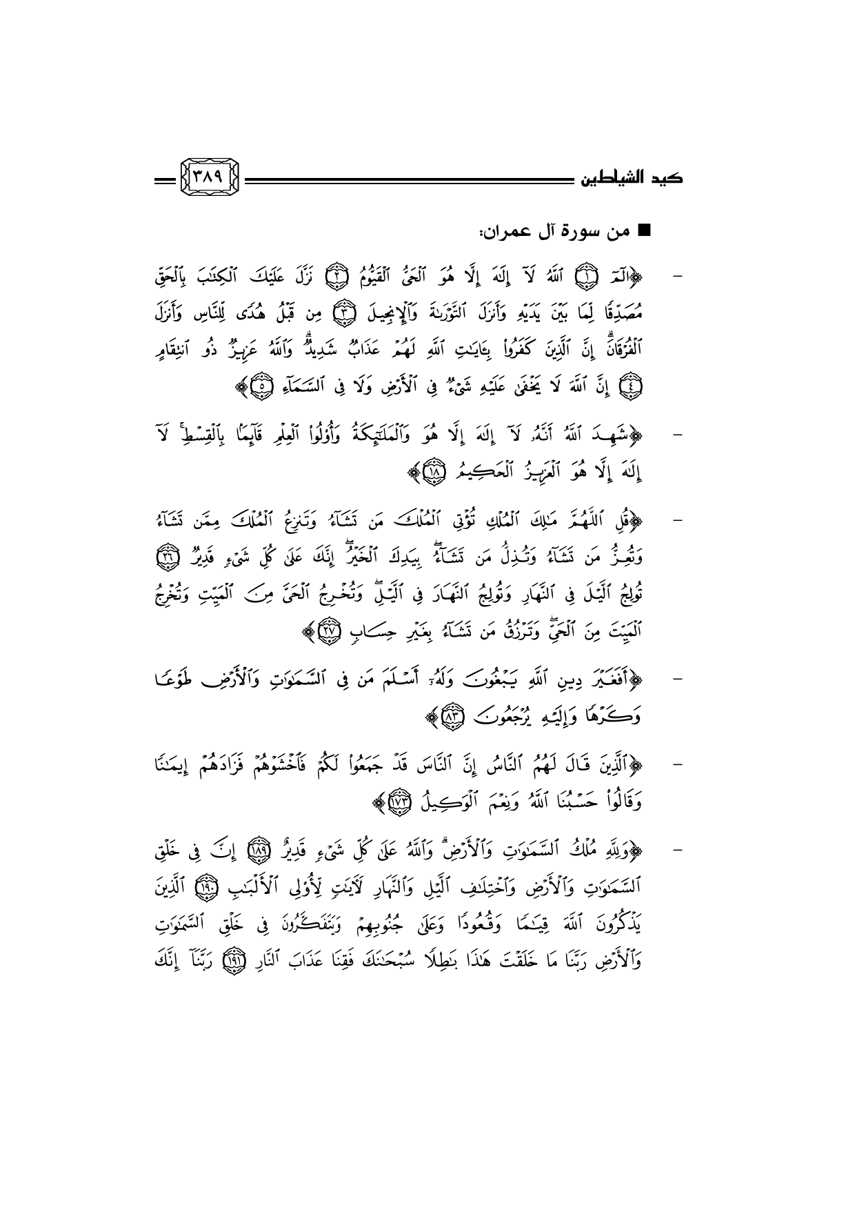 - ... {الم *اللَّهُ لاَ إِلَهَ إِلاَّ هُوَ الْحَيُّ الْقَيُّومُ *نَزَّلَ عَلَيْكَ الْكِتَابَ بِالْحَقِّ مُصَدِّقًا لِمَا بَيْنَ يَدَيْهِ وَأَنْزَلَ التَّوْرَاةَ وَالإِنْجِيلَ *مِنْ قَبْلُ هُدىً لِلنَّاسِ وَأَنْزَلَ الْفُرْقَانَ إِنَّ الَّذِينَ كَفَرُوا بِآيَاتِ اللَّهِ لَهُمْ عَذَابٌ شَدِيدٌ وَاللَّهُ عَزِيزٌ ذُو انْتِقَامٍ *إِنَّ اللَّهَ لاَ يَخْفَى عَلَيْهِ شَيْءٌ فِي الأَرْضِ وَلاَ فِي السَّمَاءِ *}