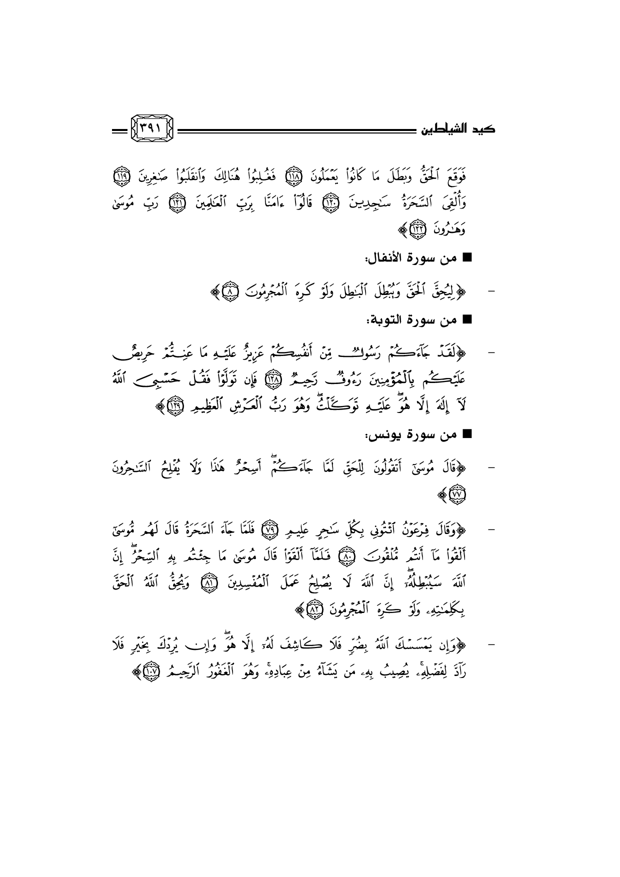 - ... {وَقَالَ فِرْعَوْنُ ائْتُونِي بِكُلِّ سَاحِرٍ عَلِيمٍ *فَلَمَّا جَاءَ السَّحَرَةُ قَالَ لَهُمْ مُوسَى أَلْقُوا مَا أَنْتُمْ مُلْقُونَ *فَلَمَّا أَلْقَوْا قَالَ مُوسَى مَا جِئْتُمْ بِهِ السِّحْرُ إِنَّ اللَّهَ سَيُبْطِلُهُ إِنَّ اللَّهَ لاَ يُصْلِحُ عَمَلَ الْمُفْسِدِينَ *وَيُحِقُّ اللَّهُ الْحَقَّ بِكَلِمَاتِهِ وَلَوْ كَرِهَ الْمُجْرِمُونَ *}