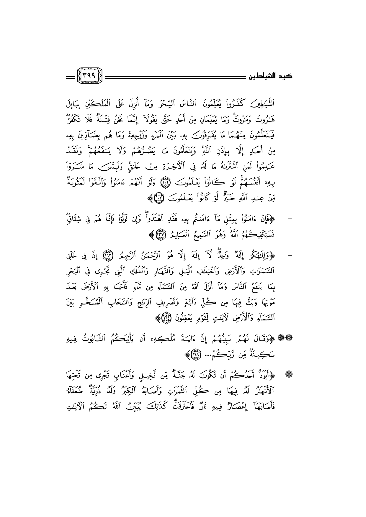 الشَّيَاطِينَ كَفَرُوا يُعَلِّمُونَ النَّاسَ السِّحْرَ وَمَا أُنْزِلَ عَلَى الْمَلَكَيْنِ بِبَابِلَ هَارُوتَ وَمَارُوتَ وَمَا يُعَلِّمَانِ مِنْ أَحَدٍ حَتَّى يَقُولاَ إِنَّمَا نَحْنُ فِتْنَةٌ فَلاَ تَكْفُرْ فَيَتَعَلَّمُونَ مِنْهُمَا مَا يُفَرِّقُونَ بِهِ بَيْنَ الْمَرْءِ وَزَوْجِهِ وَمَا هُمْ بِضَآرِّينَ بِهِ مِنْ أَحَدٍ إِلاَّ بِإِذْنِ اللَّهِ وَيَتَعَلَّمُونَ مَا يَضُرُّهُمْ وَلاَ يَنْفَعُهُمْ وَلَقَدْ عَلِمُوا لَمَنِ اُشْتَرَاهُ مَا لَهُ فِي الآخِرَةِ مِنْ خَلاَقٍ وَلَبِئْسَ مَا شَرَوْا بِهِ أَنْفُسَهُمْ لَوْ كَانُوا يَعْلَمُونَ *وَلَوْ أَنَّهُمْ آمَنُوا وَاتَّقَوْا لَمَثُوبَةٌ مِنْ عِنْدِ اللَّهِ خَيْرٌ لَوْ كَانُوا يَعْلَمُونَ *}