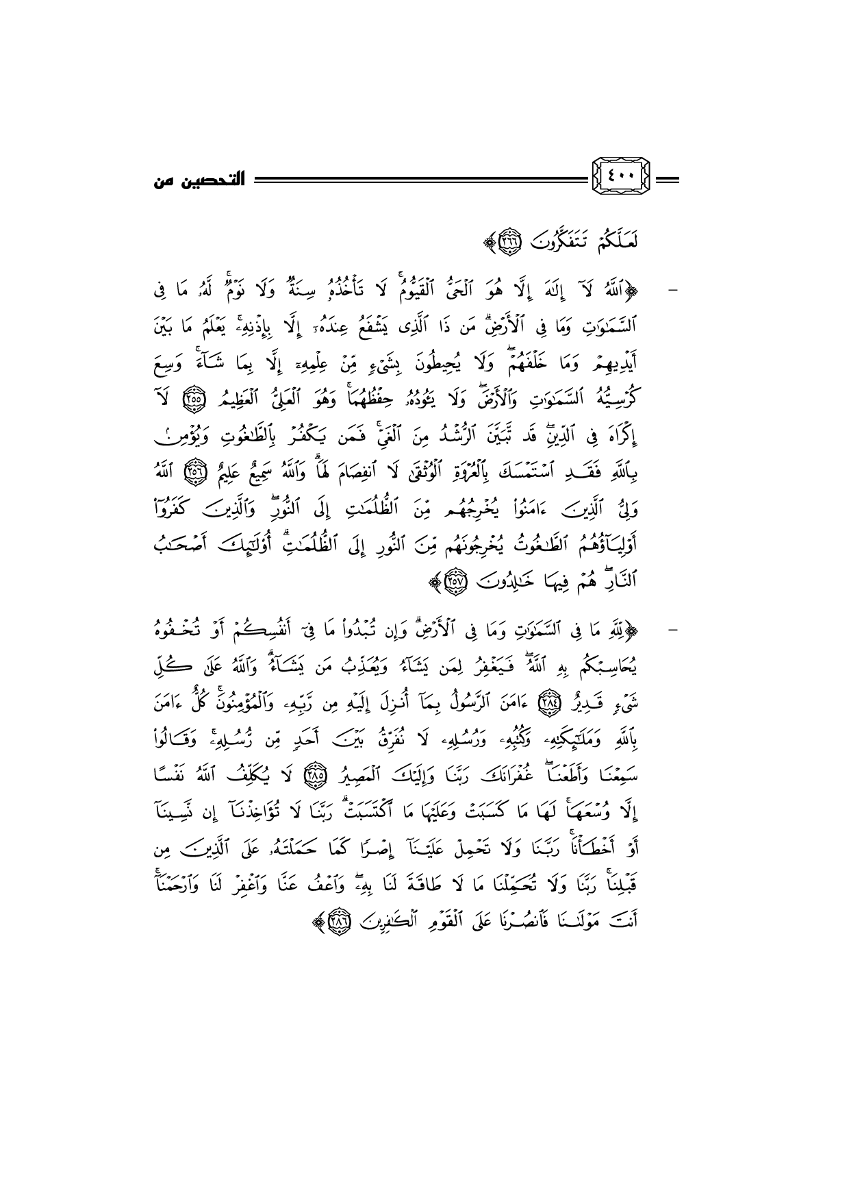 - ... {لِلَّهِ مَا فِي السَّمَاوَاتِ وَمَا فِي الأَرْضِ وَإِنْ تُبْدُوا مَا فِي أَنْفُسِكُمْ أَوْ تُخْفُوهُ يُحَاسِبْكُمْ بِهِ اللَّهُ فَيَغْفِرُ لِمَنْ يَشَاءُ وَيُعَذِّبُ مَنْ يَشَاءُ وَاللَّهُ عَلَى كُلِّ شَيءٍ قَدِيرٌ *آمَنَ الرَّسُولُ بِمَا أُنْزِلَ إِلَيْهِ مِنْ رَبِّهِ وَالْمُؤْمِنُونَ كُلٌّ آمَنَ بِاللَّهِ وَمَلاَئِكَتِهِ وَكُتُبِهِ وَرُسُلِهِ لاَ نُفَرِّقُ بَيْنَ أَحَدٍ مِنْ رُسُلِهِ وَقَالُوا سَمِعْنَا وَأَطَعْنَا غُفْرَانَكَ رَبَّنَا وَإِلَيْكَ الْمَصِيرُ *لاَ يُكَلِّفُ اللَّهُ نَفْسًا إِلاَّ وُسْعَهَا لَهَا مَا كَسَبَتْ وَعَلَيْهَا مَا اكْتَسَبَتْ رَبَّنَا لاَ تُؤَاخِذْنَا إِنْ نَسِيْنَا أَوْ أَخْطَأْنَا رَبَّنَا وَلاَ تَحْمِلْ عَلَيْنَا إِصْرًا كَمَا حَمَلْتَهُ عَلَى الَّذِينَ مِنْ قَبْلِنَا رَبَّنَا وَلاَ تُحَمِّلْنَا مَا لاَ طَاقَةَ لَنَا بِهِ وَاعْفُ عَنَّا وَاغْفِرْ لَنَا وَارْحَمْنَا أَنْتَ مَوْلاَنَا فَانْصُرْنَا عَلَى الْقَوْمِ الْكَافِرِينَ *}