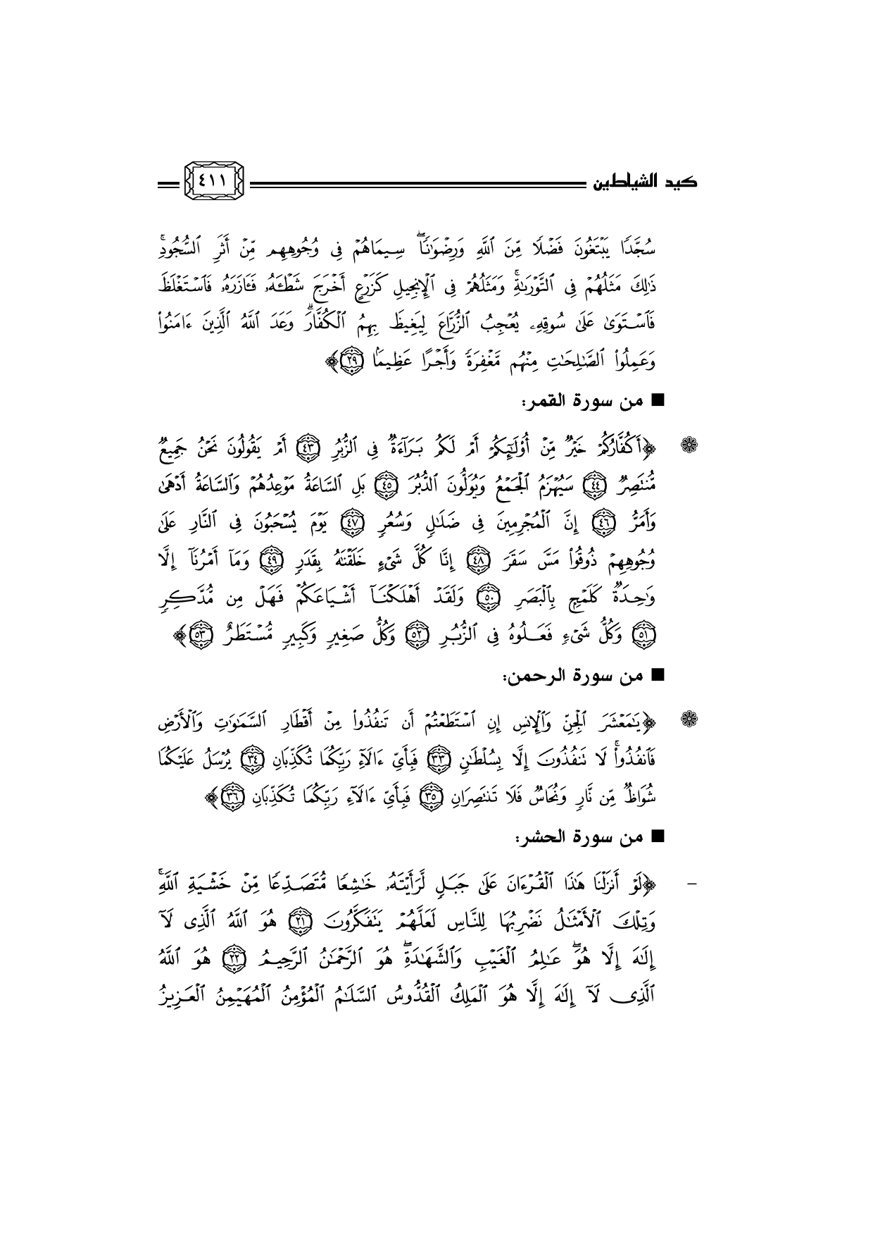 * ... {يَامَعْشَرَ الْجِنِّ وَالإِنْسِ إِنِ اسْتَطَعْتُمْ أَنْ تَنْفُذُوا مِنْ أَقْطَارِ السَّمَاوَاتِ وَالأَرْضِ فَانْفُذُوا لاَ تَنْفُذُونَ إِلاَّ بِسُلْطَانٍ *فَبِأَيِّ آلاَءِ رَبِّكُمَا تُكَذِّبَانِ *يُرْسَلُ عَلَيْكُمَا شُوَاظٌ مِنْ نَارٍ وَنُحَاسٌ فَلاَ تَنْتَصِرَانِ *فَبِأَيِّ آلاَءِ رَبِّكُمَا تُكَذِّبَانِ *}