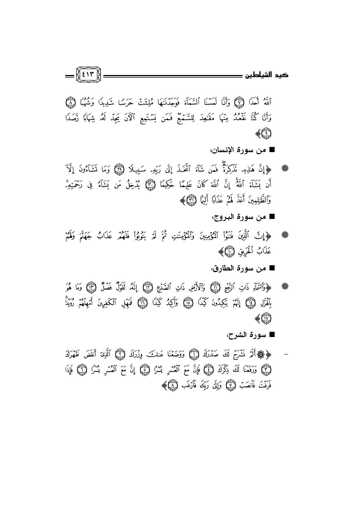 - ... {أَلَمْ نَشْرَحْ لَكَ صَدْرَكَ *وَوَضَعْنَا عَنْكَ وِزْرَكَ *الَّذِي أَنْقَضَ ظَهْرَكَ *وَرَفَعْنَا لَكَ ذِكْرَكَ *فَإِنَّ مَعَ الْعُسْرِ يُسْرًا *إِنَّ مَعَ الْعُسْرِ يُسْرًا *فَإِذَا فَرَغْتَ فَانْصَبْ *وَإِلَى رَبِّكَ فَارْغَبْ *}