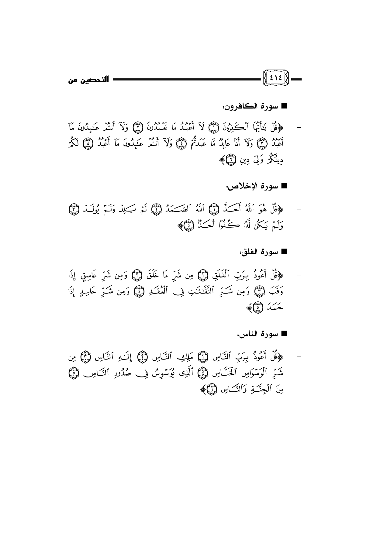 - ... {قُلْ أَعُوذُ بِرَبِّ الْفَلَقِ *مِنْ شَرِّ مَا خَلَقَ *وَمِنْ شَرِّ غَاسِقٍ إِذَا وَقَبَ *وَمِنْ شَرِّ النَفَّاثَاتِ فِي الْعُقَدِ *وَمِنْ شَرِّ حَاسِدٍ إِذَا حَسَدَ *}