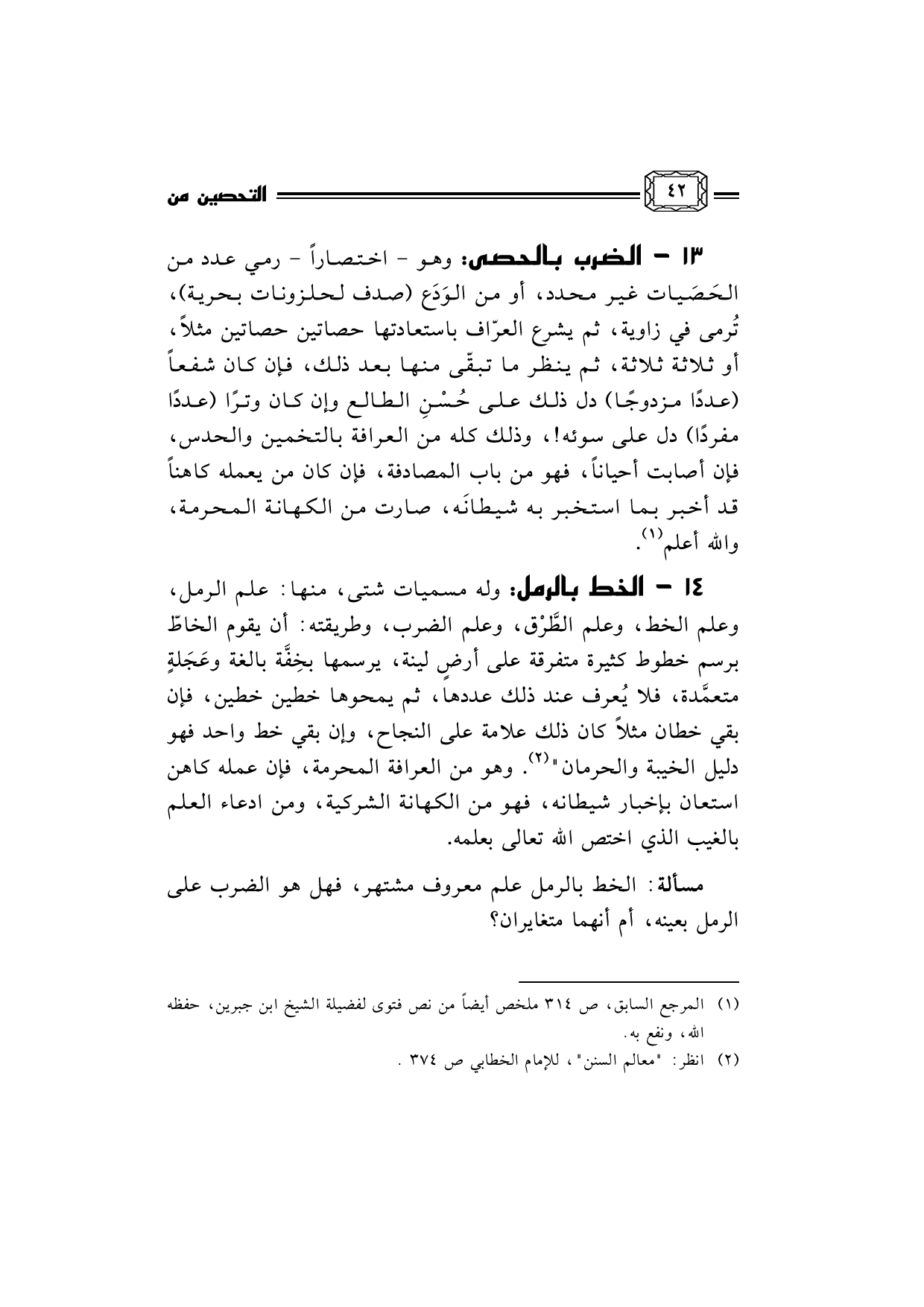 14 - الخط بالرمل: وله مسميات شتى، منها: علم الرمل، وعلم الخط، وعلم الطَّرْق، وعلم الضرب، وطريقته: أن يقوم الخاطّ برسم خطوط كثيرة متفرقة على أرضٍ لينة، يرسمها بخِفَّة بالغة وعَجَلةٍ متعمَّدة، فلا يُعرف عند ذلك عددها، ثم يمحوها خطين خطين، فإن بقي خطان مثلاً كان ذلك علامة على النجاح، وإن بقي خط واحد فهو دليل الخيبة والحرمان" (¬2) . وهو من العرافة المحرمة، فإن عمله كاهن استعان بإخبار شيطانه، فهو من الكهانة الشركية، ومن ادعاء العلم بالغيب الذي اختص الله تعالى بعلمه.