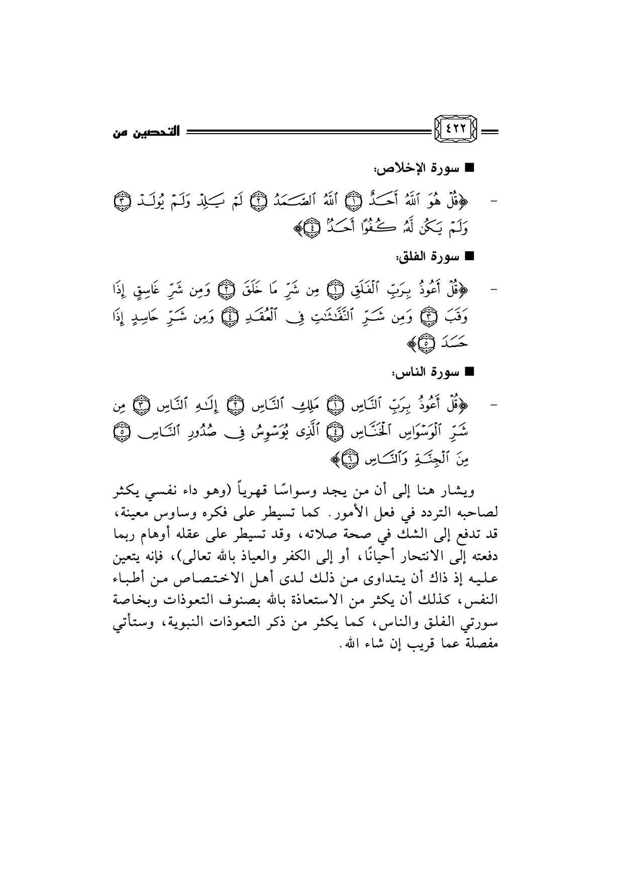 ويشار هنا إلى أن من يجد وسواسًا قهرياً (وهو داء نفسي يكثر لصاحبه التردد في فعل الأمور. كما تسيطر على فكره وساوس معينة، قد تدفع إلى الشك في صحة صلاته، وقد تسيطر على عقله أوهام ربما دفعته إلى الانتحار أحيانًا، أو إلى الكفر والعياذ بالله تعالى) ، فإنه يتعين عليه إذ ذاك أن يتداوى من ذلك لدى أهل الاختصاص من أطباء النفس، كذلك أن يكثر من الاستعاذة بالله بصنوف التعوذات وبخاصة سورتي الفلق والناس، كما يكثر من ذكر التعوذات النبوية، وستأتي مفصلة عما قريب إن شاء الله.