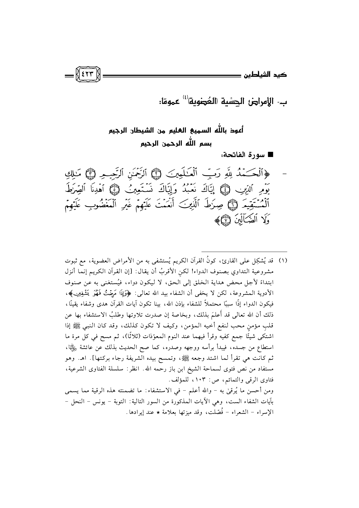 (¬1) قد يُشكِل على القارئ، كونُ القرآن الكريم يُستشفى به من الأمراض العضوية، مع ثبوت مشروعية التداوي بصنوف الدواء! لكنِ الأقربُ أن يقال: [إن القرآن الكريم إنما أنزل ابتداءً لأجل محض هداية الخلق إلى الحق، لا ليكون دواء، فيُستغنى به عن صنوف الأدوية المشروعة، لكن لا يخفى أن الشفاء بيد الله تعالى: {وَإِذَا مَرِضْتُ فَهُوَ يَشْفِينِ *} ، فيكون الدواء إذًا سببًا محتملاً للشفاء بإذن الله، بينا تكون آيات القرآن هدى وشفاء يقينًا، ذلك أن الله تعالى قد أَعلمَ بذلك، وبخاصة إن صدرت تلاوتها وطلبُ الاستشفاء بها عن قلبِ مؤمنٍ محب لنفع أخيه المؤمن، وكيف لا تكون كذلك، وقد كان النبي صلى الله عليه وسلم إذا اشتكى شيئًا جمع كفيه وقرأ فيهما عند النوم المعوّذات (ثلاثًا) ، ثم مسح في كل مرة ما استطاع من جسده، فيبدأ برأسه ووجهه وصدره، كما صح الحديث بذلك عن عائشة رضي الله عنها، ثم كانت هي تقرأ لما اشتد وجعه صلى الله عليه وسلم، وتمسح بيده الشريفة رجاء بركتها] . اهـ. وهو مستفاد من نص فتوى لسماحة الشيخ ابن باز رحمه الله. انظر: سلسلة الفتاوى الشرعية، فتاوى الرقى والتمائم، ص: 103، للمؤلف. ... ومن أحسن ما يُرقى به - والله أعلم - في الاستشفاء: ما تضمنته هذه الرقية مما يسمى بآيات الشفاء الست، وهي الآيات المذكورة من السور التالية: التوبة - يونس - النحل - الإسراء - الشعراء - فُصّلت، وقد ميزتها بعلامة * عند إيرادها.